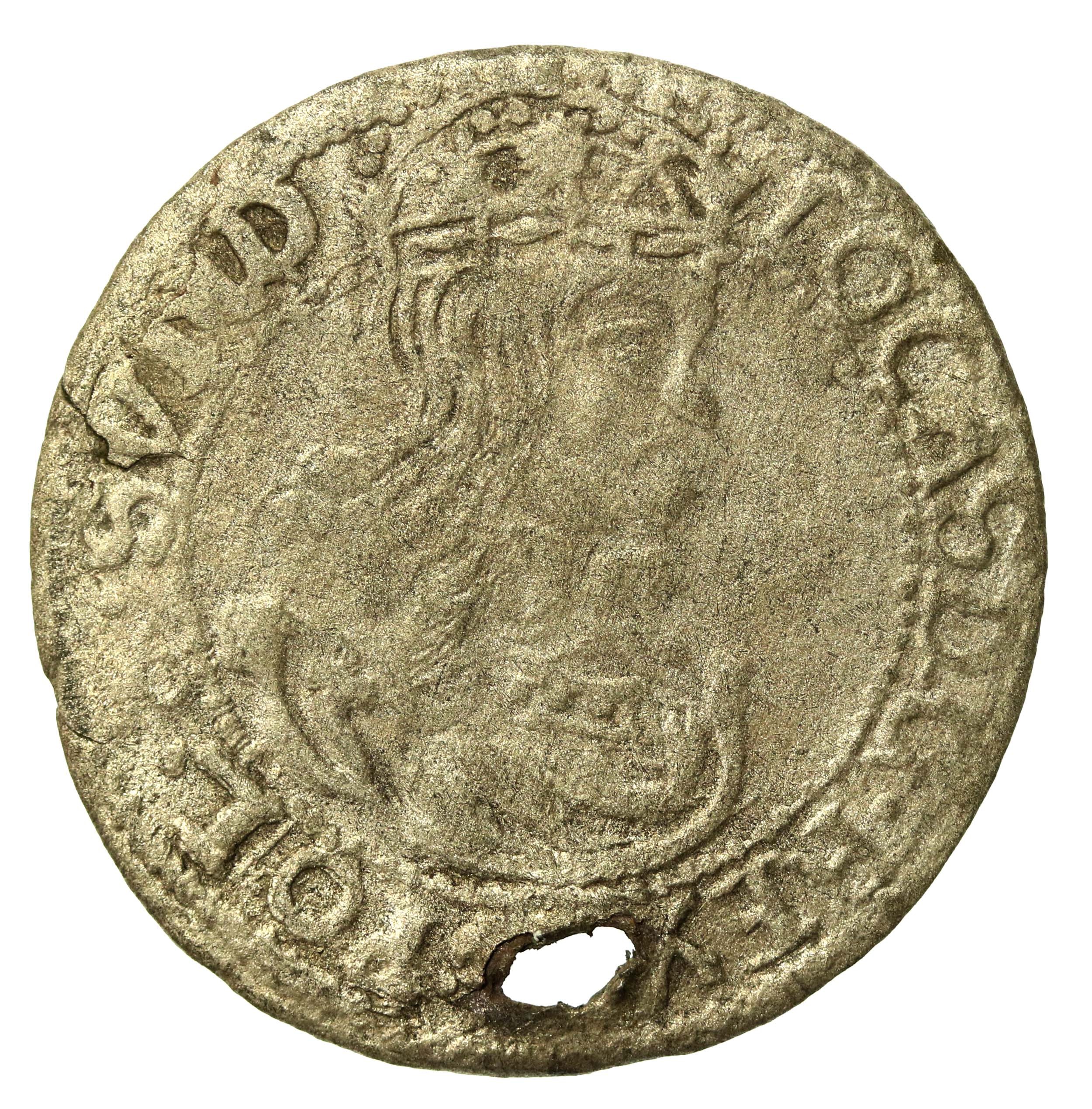 Jan II Kazimierz, naśladownictwo szóstaka. Stan zachowania 3-. Ciekawa imitacja, ze srebra dobrej próby, całkiem czytelna, jednak z otworem. Stan zachowania 3-