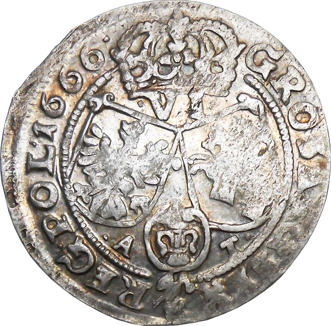 Szóstak wybity dla Jana II Kazimierza w 1666 roku w mennicy bydgoskiej, litery AT.