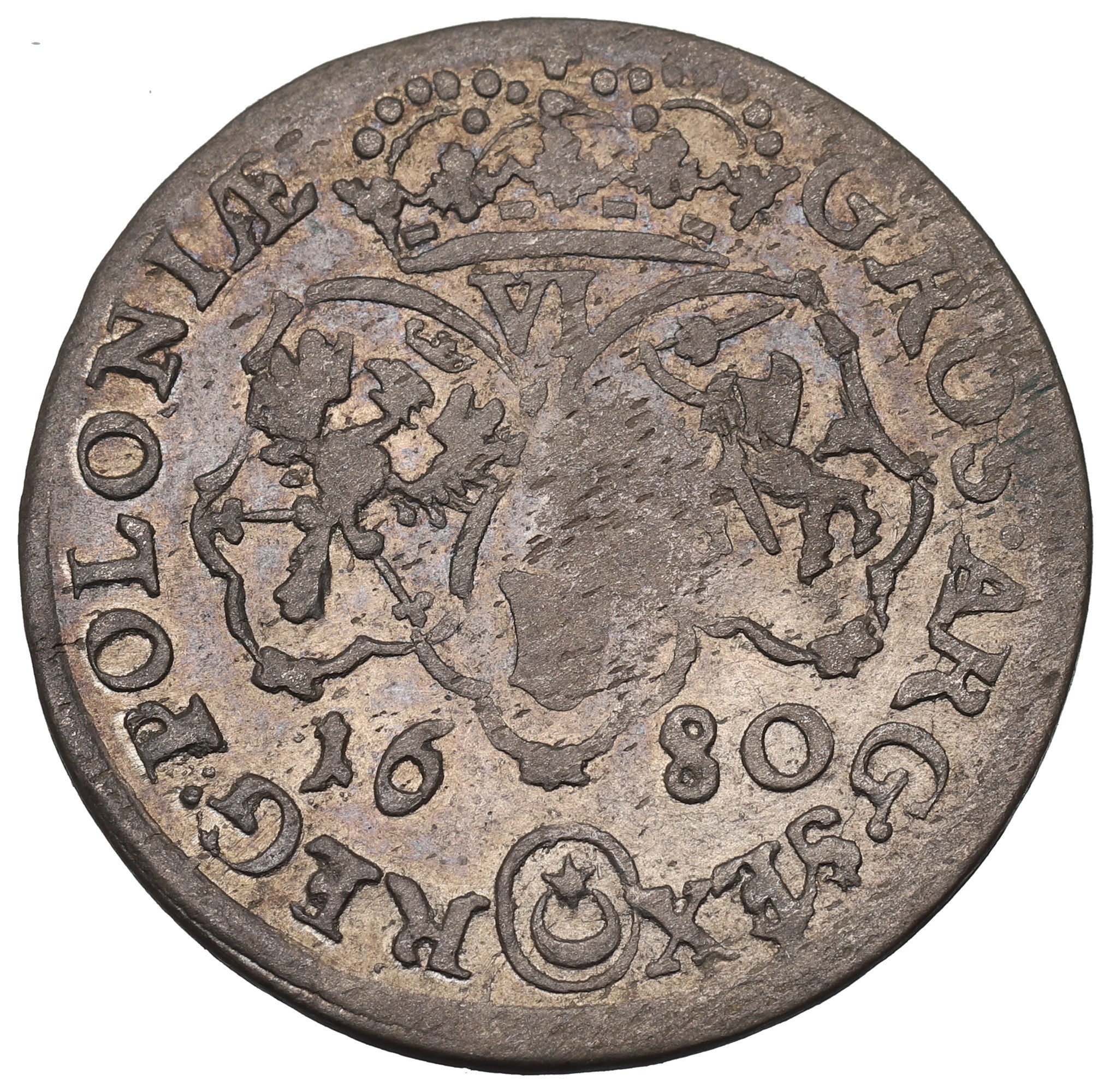 Rewers: ukoronowana czterokabłąkowa korona z pięcioma fleuronami treflowymi, z klejnotami na kabłąkach, trójpolowa tarcza herbowa, z herbami Korony Królestwa Polskiego, Wielkiego Księstwa Litewskiego i herbem rodowym Sobieskich - Janina, pod koroną oznaczenie nominału VI, pod tarczą data 16-80; w otoku legenda przedzielona herbem Leliwa w owalnej tarczy herbowej: