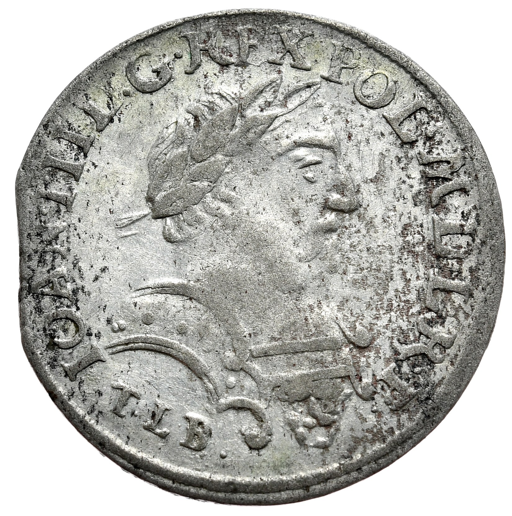 Popiersie króla w zbroi, litera C pomiędzy trzema tarczami herbowymi, herb Leliwa w tarczy rozbudowanej.