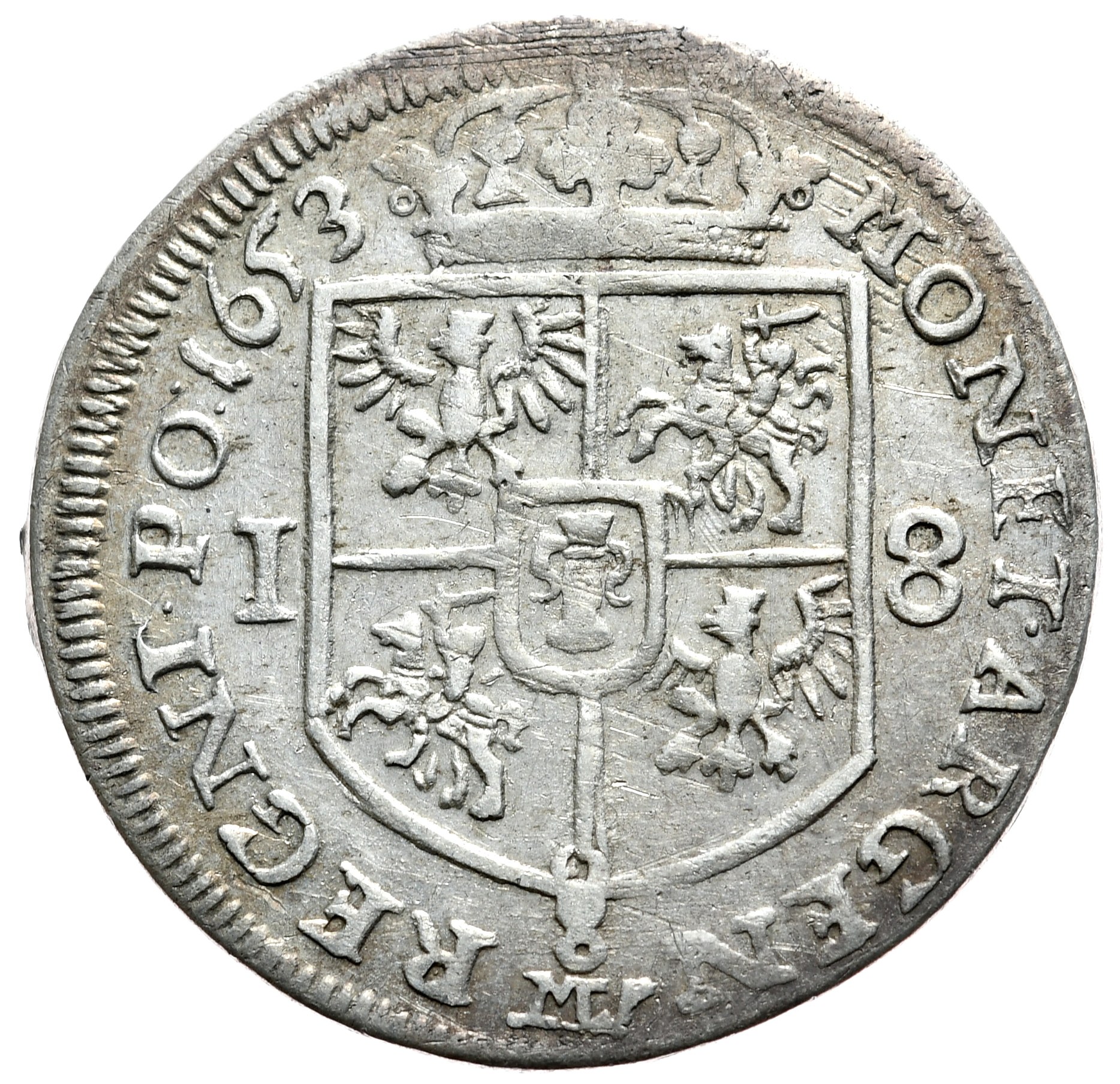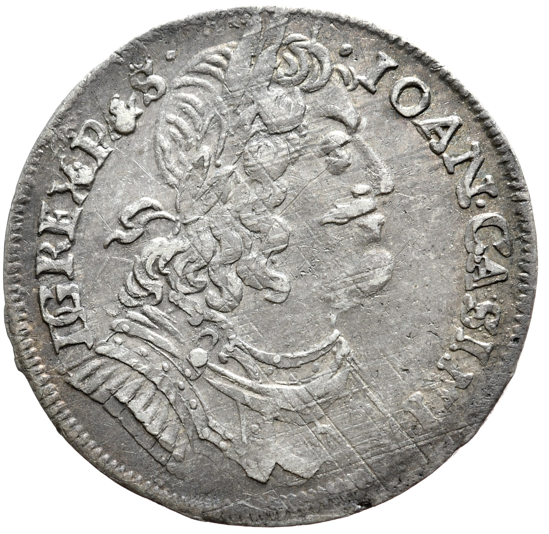 Ort wschowski w bardzo ładnym stanie zachowania z popiersiem Jana Kazimierza w laurze i zbroi typu rzymskiego z widocznymi nitami. Order Złotego Runa na wstędze zawieszony na piersi króla. Ramię z 10 rzemiennymi paskami. Powyżej owalna brosza spinająca fałdy płaszcza. Na rewersie czteropolowa tarcza herbowa z Orłem i Pogonią. Pośrodku mała tarcza ze Snopkiem Wazów. Ciekawa korona z czterema kabłąkami. Po bokach korony kółeczka. Na spodzie tarczy herb Wieniawa podskarbiego koronnego Bogusława Leszczyńskiego a pod nim literki MW w ligaturze.