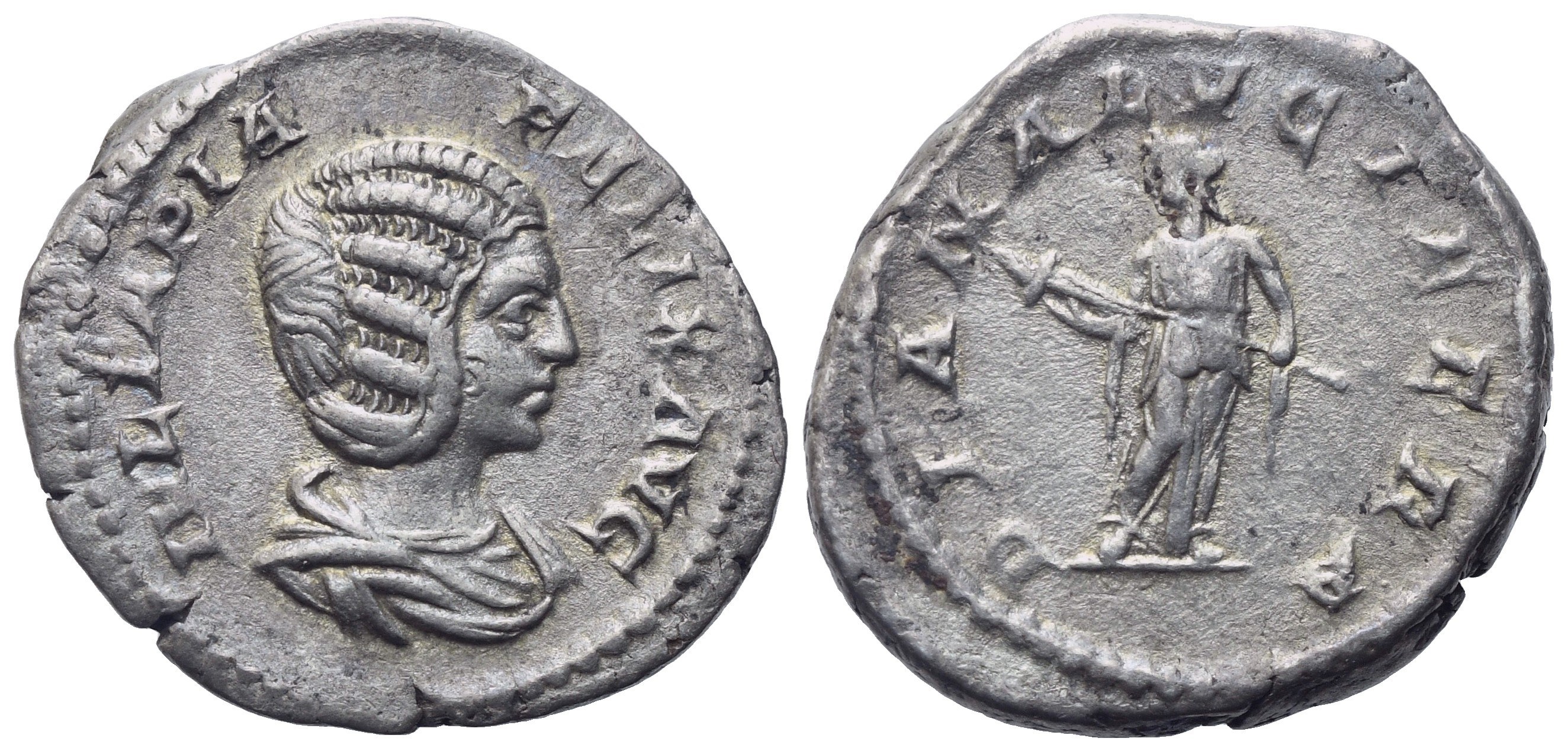 IVLIA PIA FELIX AVG Draped bust to r.; Rv. DIANA LVCIFERA Diana standing facing, head to l., holding torch in both hands. RIC IV 373A (Caracalla); BMCRE 1 (Caracalla); RSC 32. Good very fine.