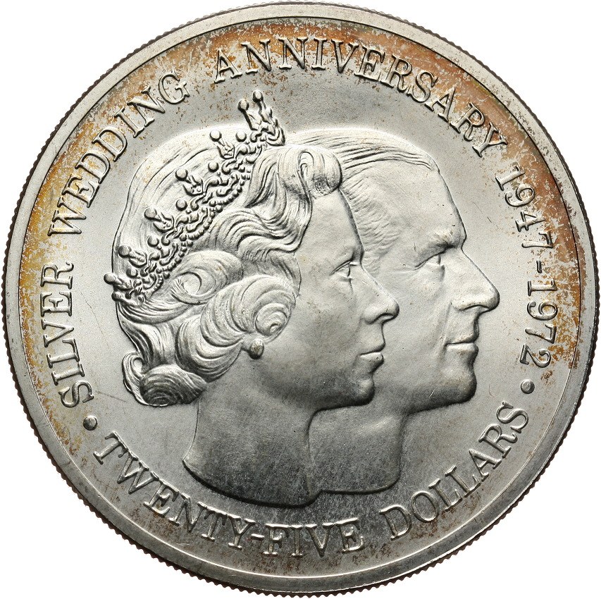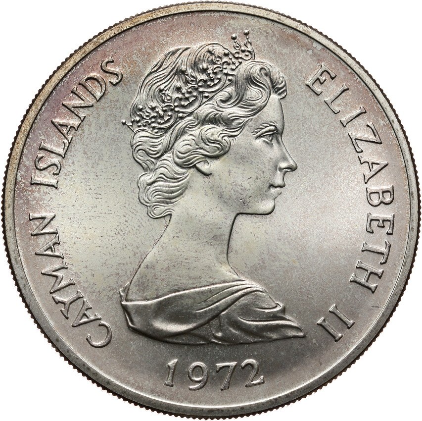 Moneta wybita na wyspie Kajmany, należącej do Wielkiej Brytanii, z okazji srebrnego wesela brytyjskiej pary królewskiej. Moneta bita stemplem zwykłym, nakład 186 tysięcy. Srebro próby 925 , waga 51,35 g co daje 1,53 uncji czystego srebra. 1 dolar kajmański to 4,63 złotego.
