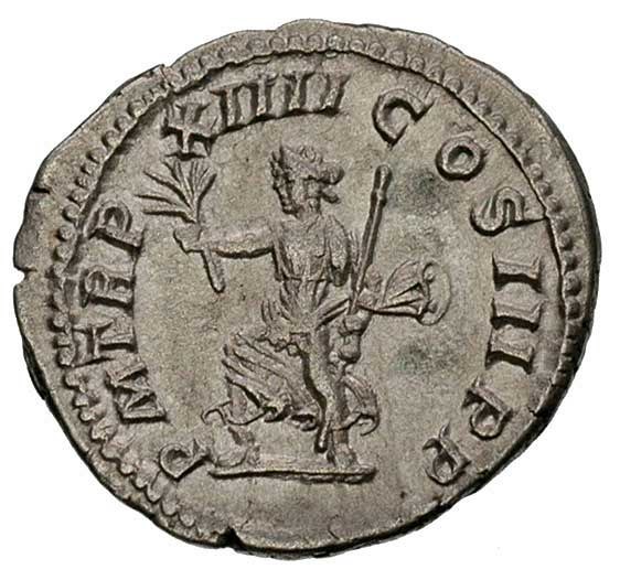 CESARSTWO RZYMSKIE, Karakalla 198-217, denar, Aw: Popiersie w wieńcu w prawo i napis, Rw: Pax z gałązką i berłem krocząca w lewo, napis PM TR P XIIII COS III PP, Sear 190 RIC 184, 3.19 g