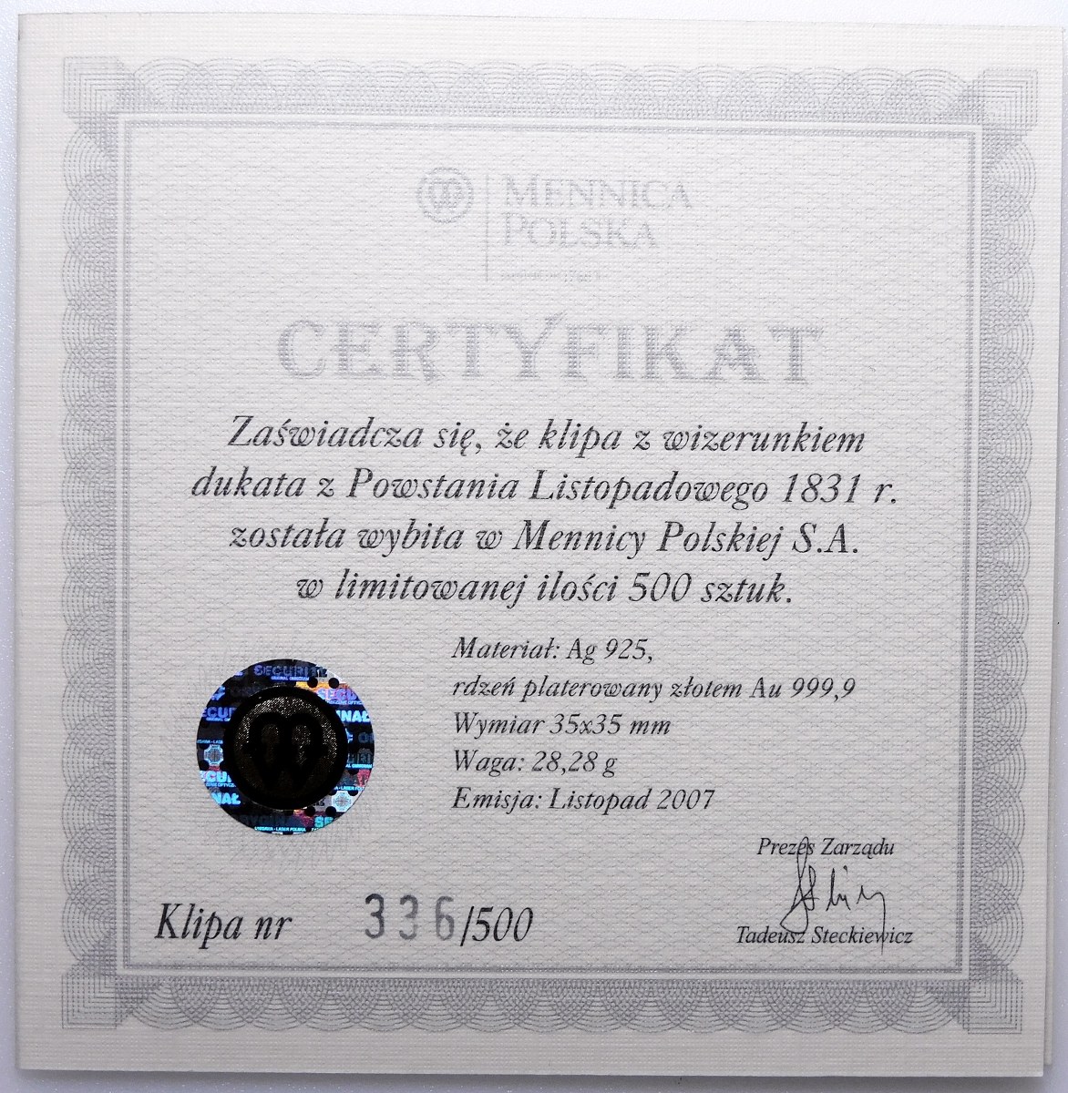 Klipa dukata z Powstania Listopadowego 1831 roku