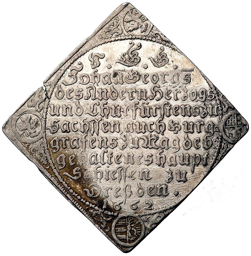 Jan Jerzy II 1656-1680, klipa strzelecka talara 1662, Drezno, Aw: Herby nad kolumnami i pomnikiem, napis wokół, w rogach herby, Rw: Napis w 10 wierszach, w rogach monety herby, Schnee 914, Dav. 7631, tło cyzelowane, moneta była wybita z okazji zaślubin córki Zofii