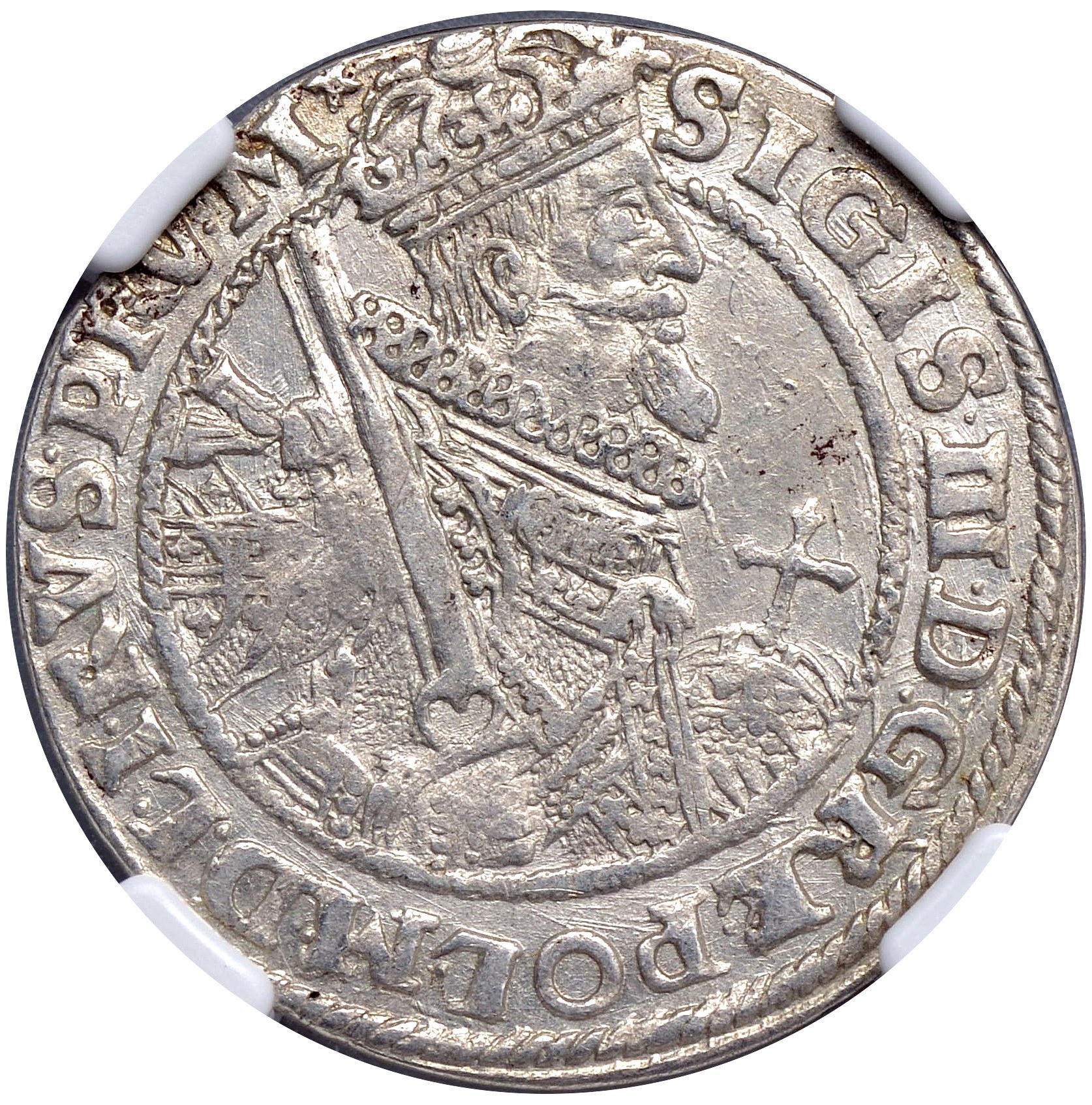 Popiersie króla w dużej koronie, z naramiennikiem w małe kwiatki (rzadki wariant) oraz dwiema szarfami, skrzyżowanymi na piersi.