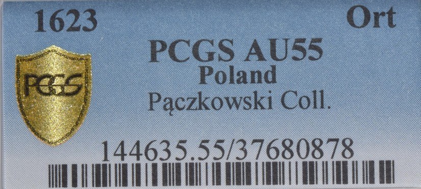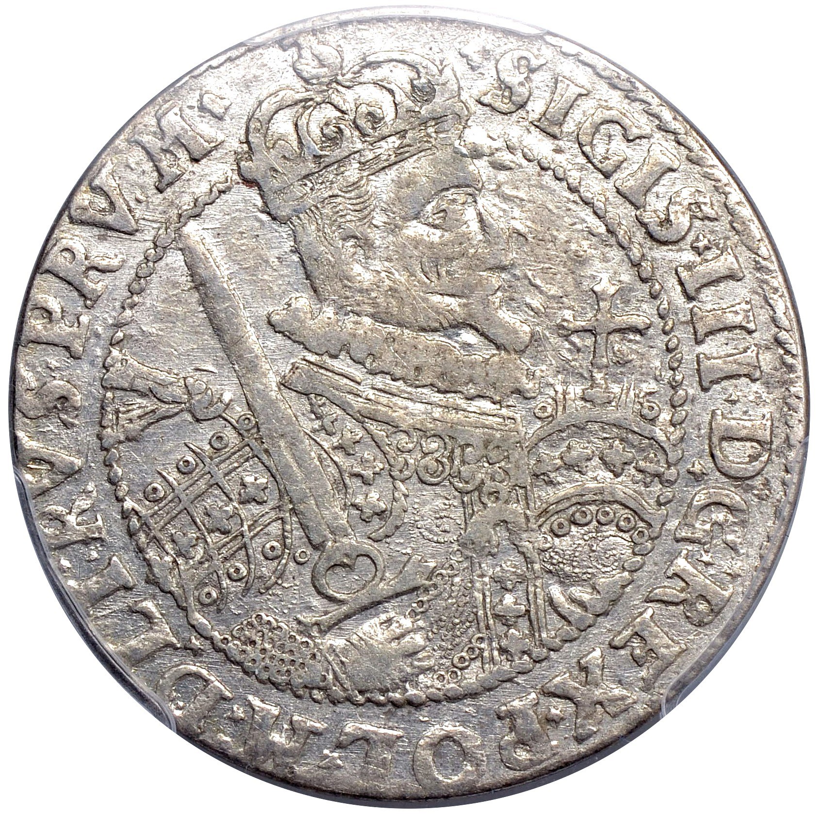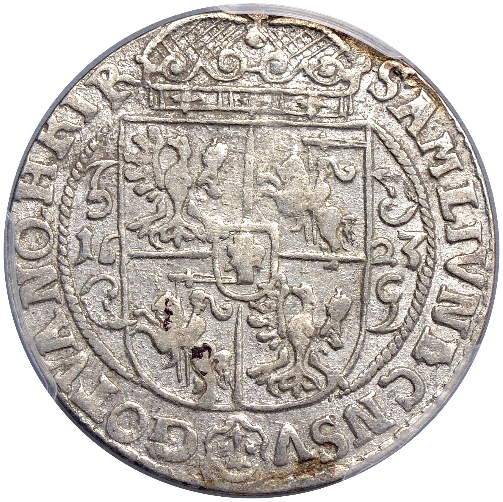 Portret króla w podstawowej odmianie z 1623 roku, bez kółeczek w koronie, z kokardą z dwoma wstęgami zakończonymi frędzlami.