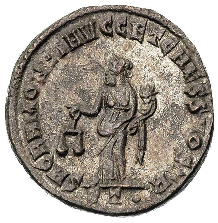 CESARSTWO RZYMSKIE, Konstancjusz I 293-306, follis, Aw: Popiersie w wieńcu w prawo i napis, Rw: Stojąca Moneta z wagą w dłoni i napis SACRA MONETA AVGG ET CAESS NOSTR, w odcinku ST(?), Sear 3676, 9.53 g, patyna