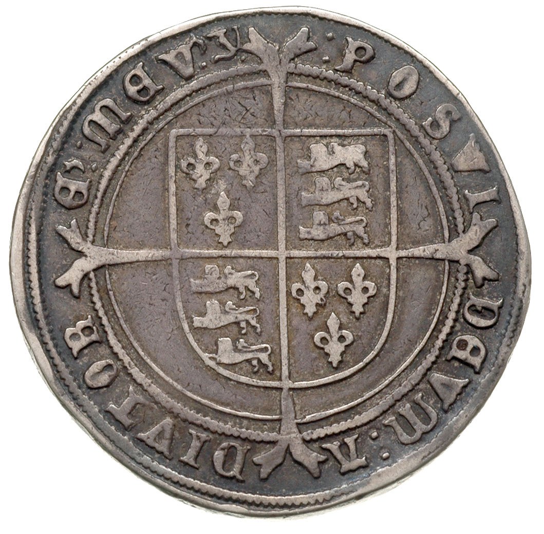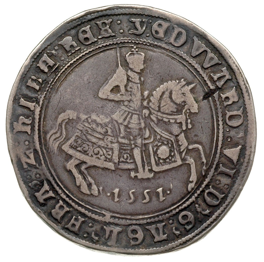 Edward VI 1547-1553, korona 1551, Aw: Król na koniu w prawo, Rw: Tarcza na tle krzyża, srebro 30.61 g, S. 2478, patyna
