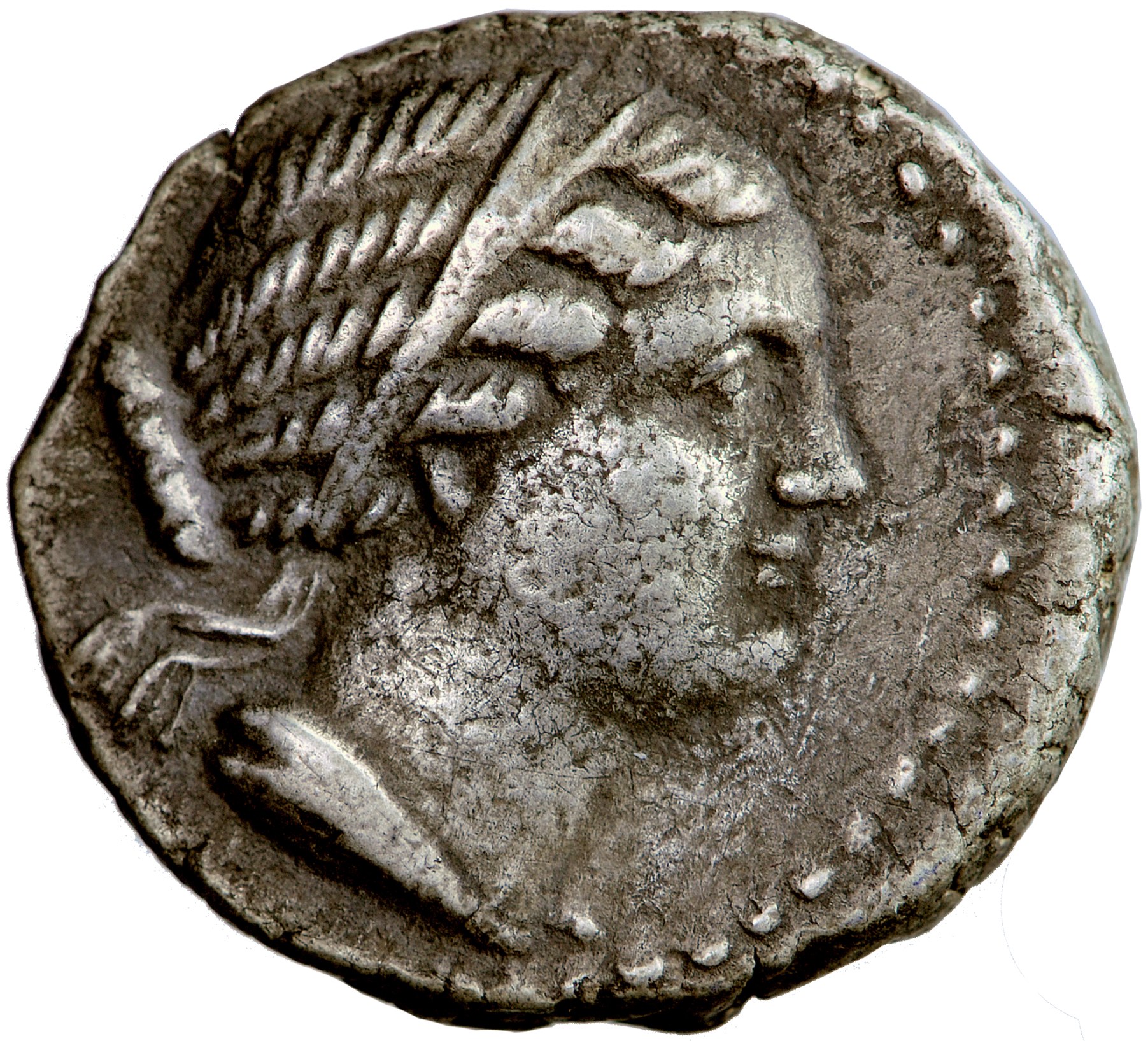 Niezwykle ciekawa moneta od lat dyskutowana przez numizmatyków. Przypisywana Berenike I (zm. 279 r.), żonie Ptolemeusza I lub też Berenike II (267-221), żonie Ptolemeusza III. Bardzo prawdopodobne, że za emisją tych didrachm stał Magas (308-253), król Cyrenajki, przez wiele lat zwaśniony ze swoim bratem przyrodnim Ptolemeuszem II. Monogram widniejący na prezentowanej monecie często jest odczytywany jako MAG, co ma wskazywać właśnie na Magasa. Magas był synem Berenike I, zarazem ojcem Berenike II, która to będąc kilkuletnią dziewczynką została wydana za mąż za Demetriusza Pięknego. Ten niepopularny władca został niedługo potem zgładzony, a rządy w Cyrenajce objęła Berenike. Natomiast jej drugie małżeństwo z Ptolemeuszem III w 246 r., spowodowało włączenie Cyrenajki pod egipskie panowanie. Prezentowana moneta zapewne pochodzi z ostatniego okresu życia Magasa, lub niedługo potem, kiedy Berenike II grała kluczowe role na scenie politycznej a relacje Cyrenajki i Egiptu były bardzo dobre.