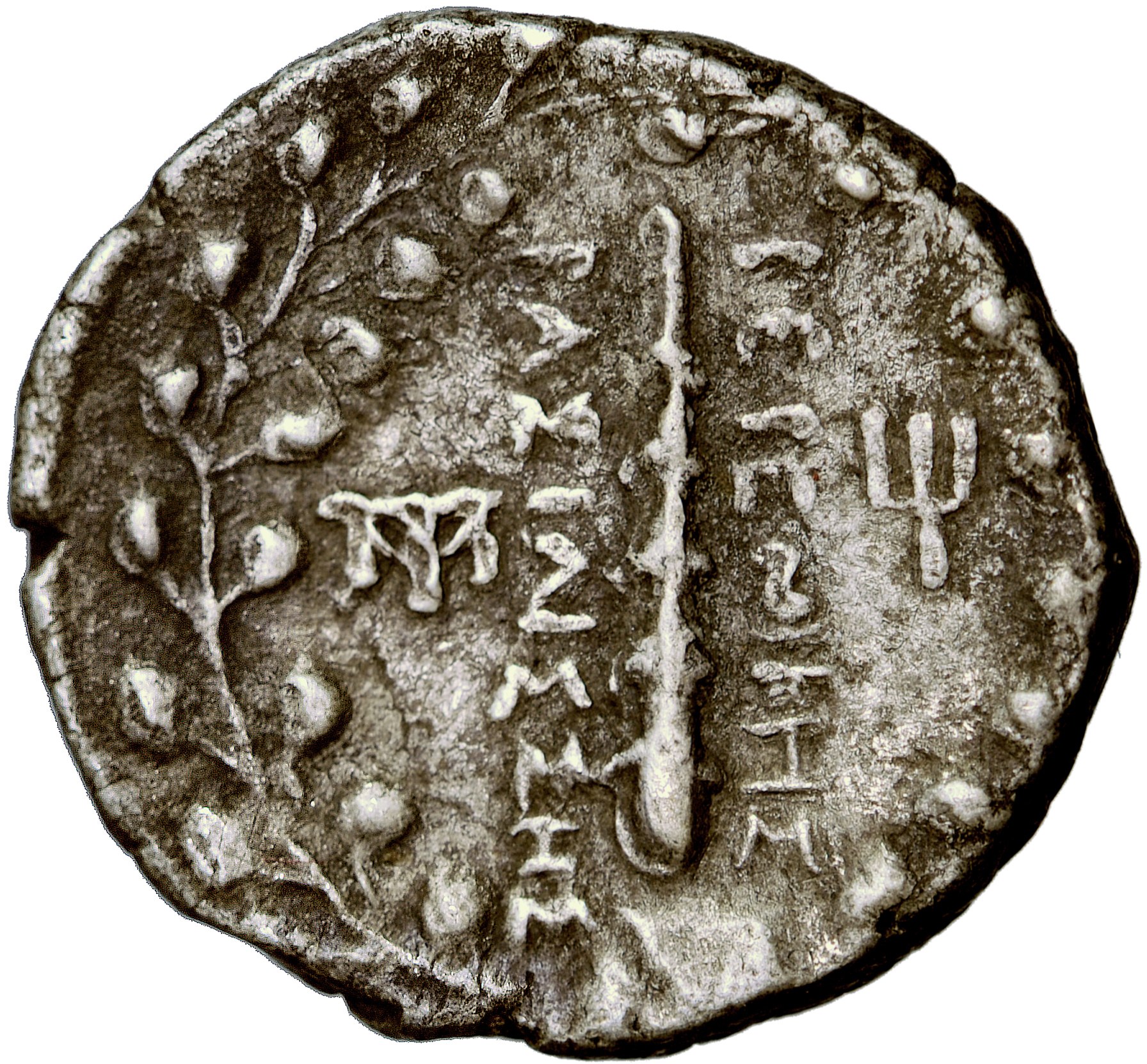 Rv. Maczuga, w lewym polu monogram, w prawym trójząb - całość otoczona wieńcem. BAΣIΛIΣΣHΣ - BEPENIKHΣ po obu stronach maczugi.