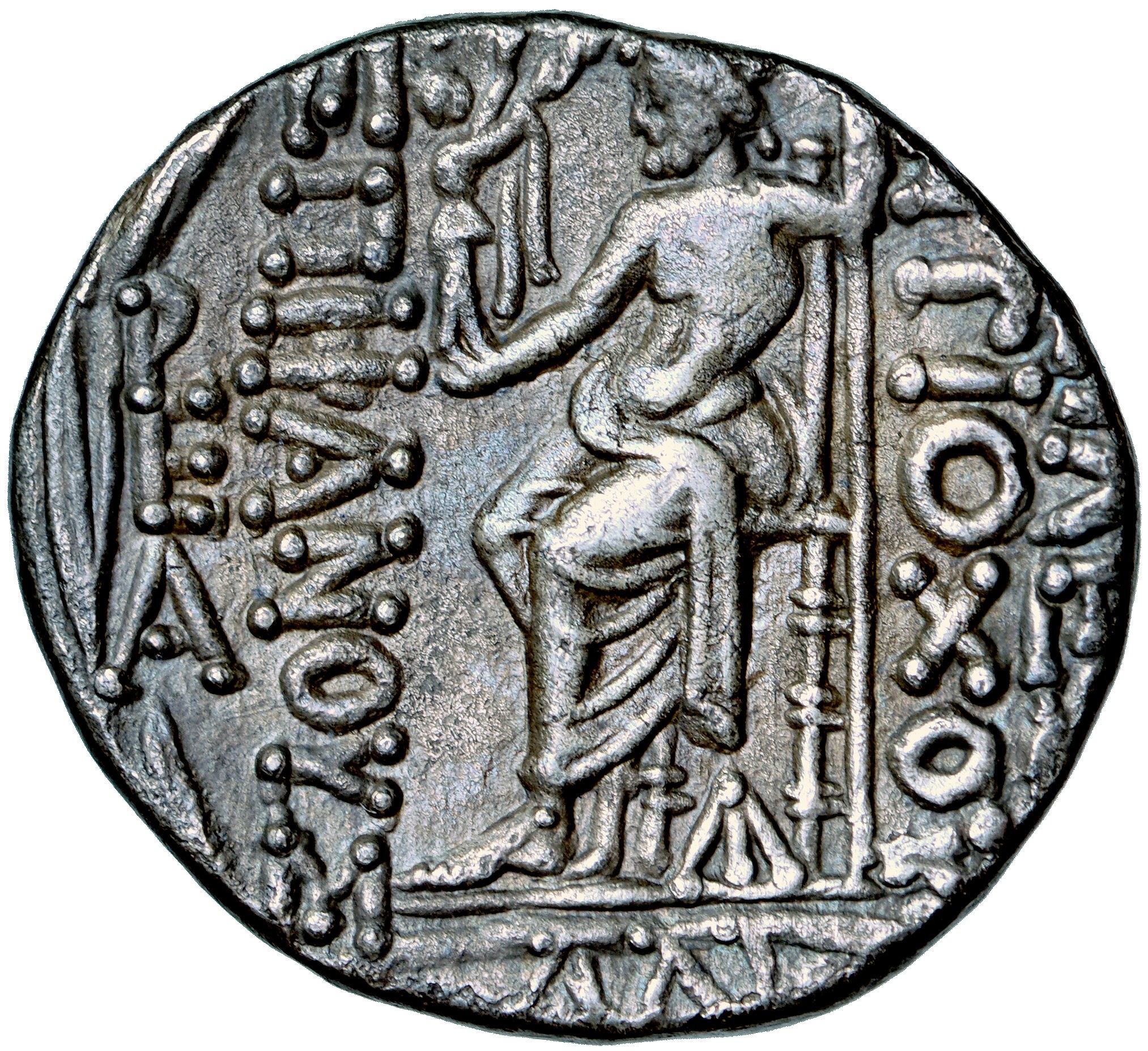 Rv. Zeus siedzący na tronie w lewo, trzymający długie berło w lewej ręce i Nike z wieńcem w wyciągniętej prawej ręce, w lewym polu monogram PE ponad A, pod tronem ΔI. [ΒAΣ]ΙΛE[ΩΣ] / [Α]NTIOXOY - EΠIΦANOYΣ, pionowo, początek w prawym polu na górze. Całość otoczona wieńcem laurowym.