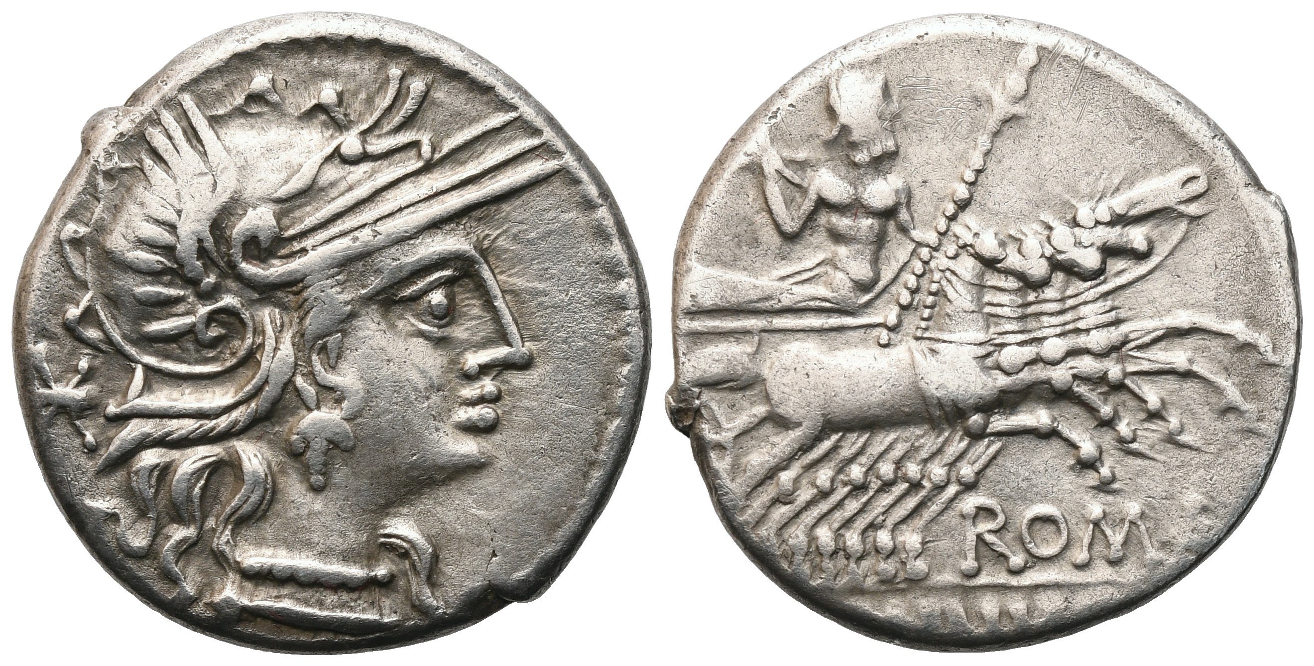 Helmeted head of Roma r.; Rv. Jupiter driving galloping quadriga r., hurling thunderbolt and holding sceptre; below, ROMA and in exergue, L·MINVCI. Babelon Minucia 15. Sydenham 470. RBW 1020. Crawford 248/1. Good very fine.