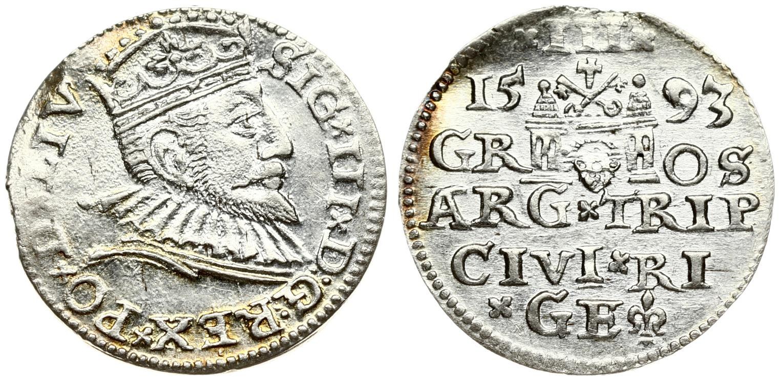 Latvia 3 Groszy 1593 Riga Sigismund III Vasa(1587-1632). Averse: Crowned bust right. Reverse...