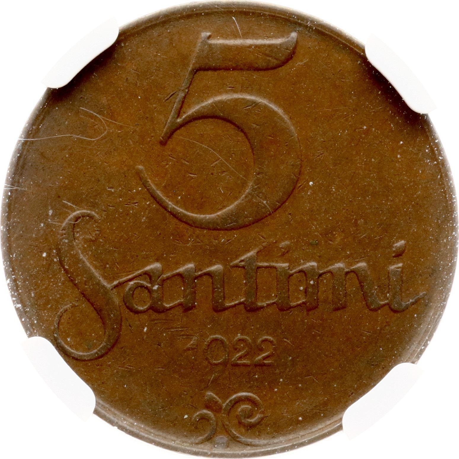 Latvia 5 Santimi 1922 NGC AU 58 BN