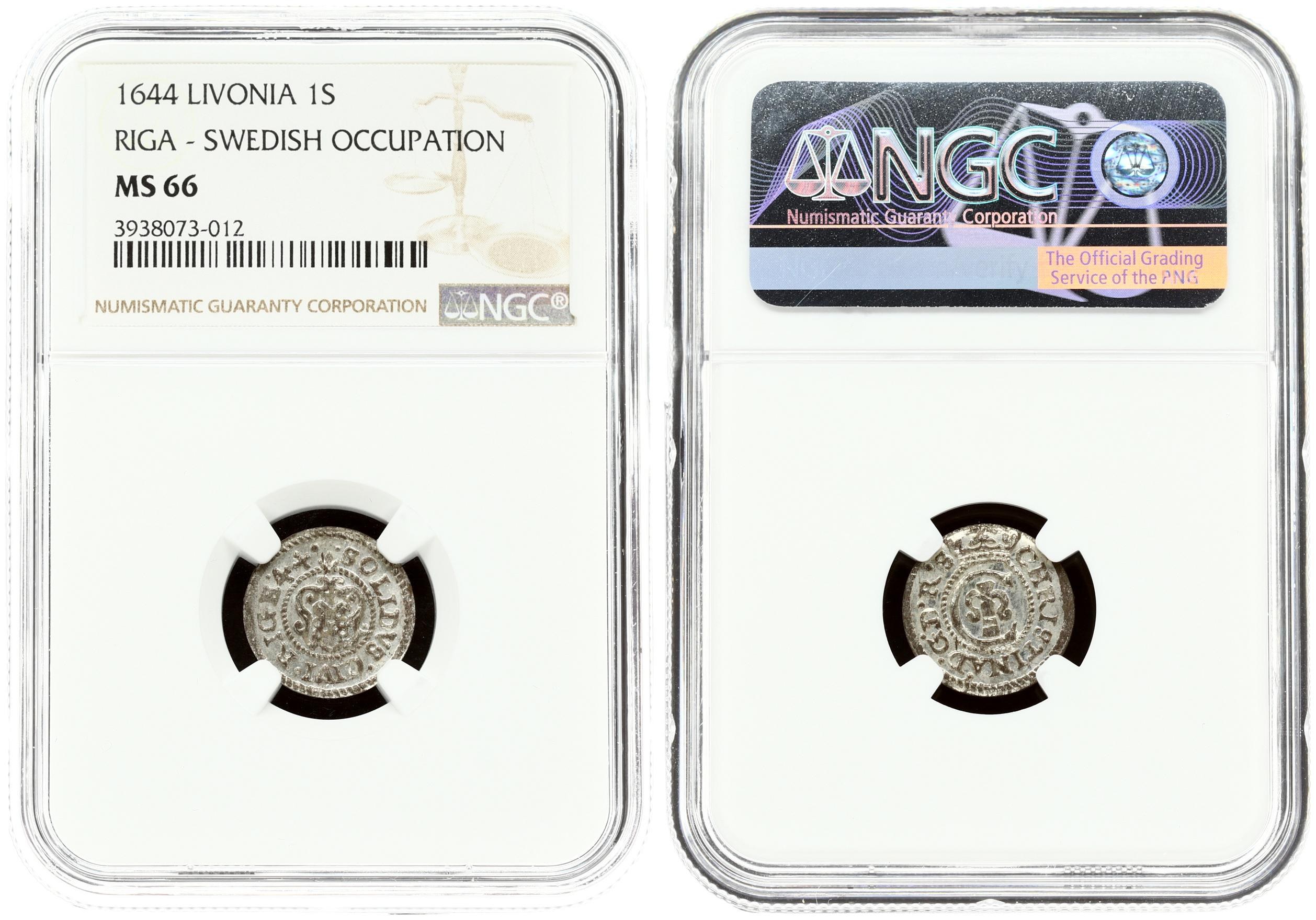 Latvia Livonia 1 Solidus 1644 Riga Christina (1632-1654). SWEDISH OCCUPATION. Averse: Crowned C with Vasa arms within inner circle. Averse Legend: CHRISTINA D G DR S SOLIDUS CIVI RIGENSIS. Reverse: City emblem. Silver. KM 21. NGC MS 66