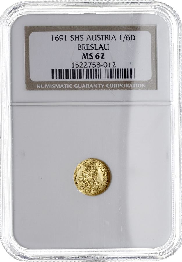 ŚLĄSK pod panowaniem Habsburgów, Leopold I, 1658-1705, 1/6 dukata 1691, Wrocław, Aw: Popiersie cesarza w prawo i napis wokoło, Rw: Orzeł cesarski i napis wokoło, F.u.S. 579, Herinek 513, złoto, moneta w pudełku firmy NGC z certyfikatem MS62, bardzo ładne
