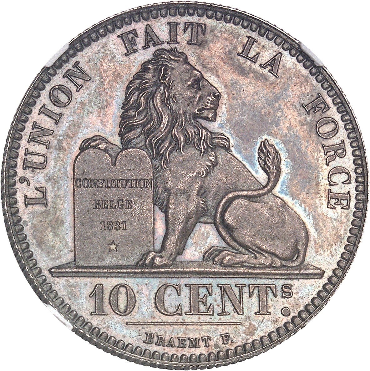 Rv. L'UNION FAIT LA FORCE. Lion assis à gauche, la patte posée sur une table inscrite CONSTITUTION BELGE 1831 ; à l'exergue : 10 CENTs et signature BRAEMT F.