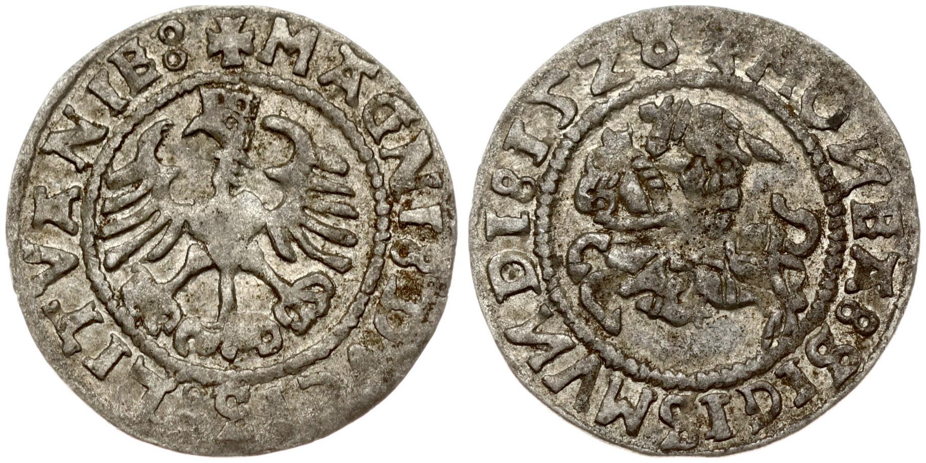 Lithuania 1/2 Grosz 1528 Vilnius. Sigismund I the Old (1506-1548). Obverse Lettering: MONETA: SIGISMVNDI: 15Z8 +. Reverse Lettering: MAGNI: DVCIS: LITVANIE . . . . +. Silver. Ivanauskas 1S347-10 (RR) RARE