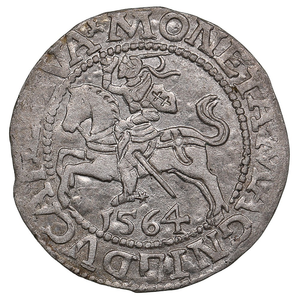 Rev.: Coat of arms of Lithuania – ‘Pogonia’: knight on horseback left, brandishing sword; below, date 1564; “MONETA MAGNI (mintmaster’s mark) DVCAT LITVA”.
