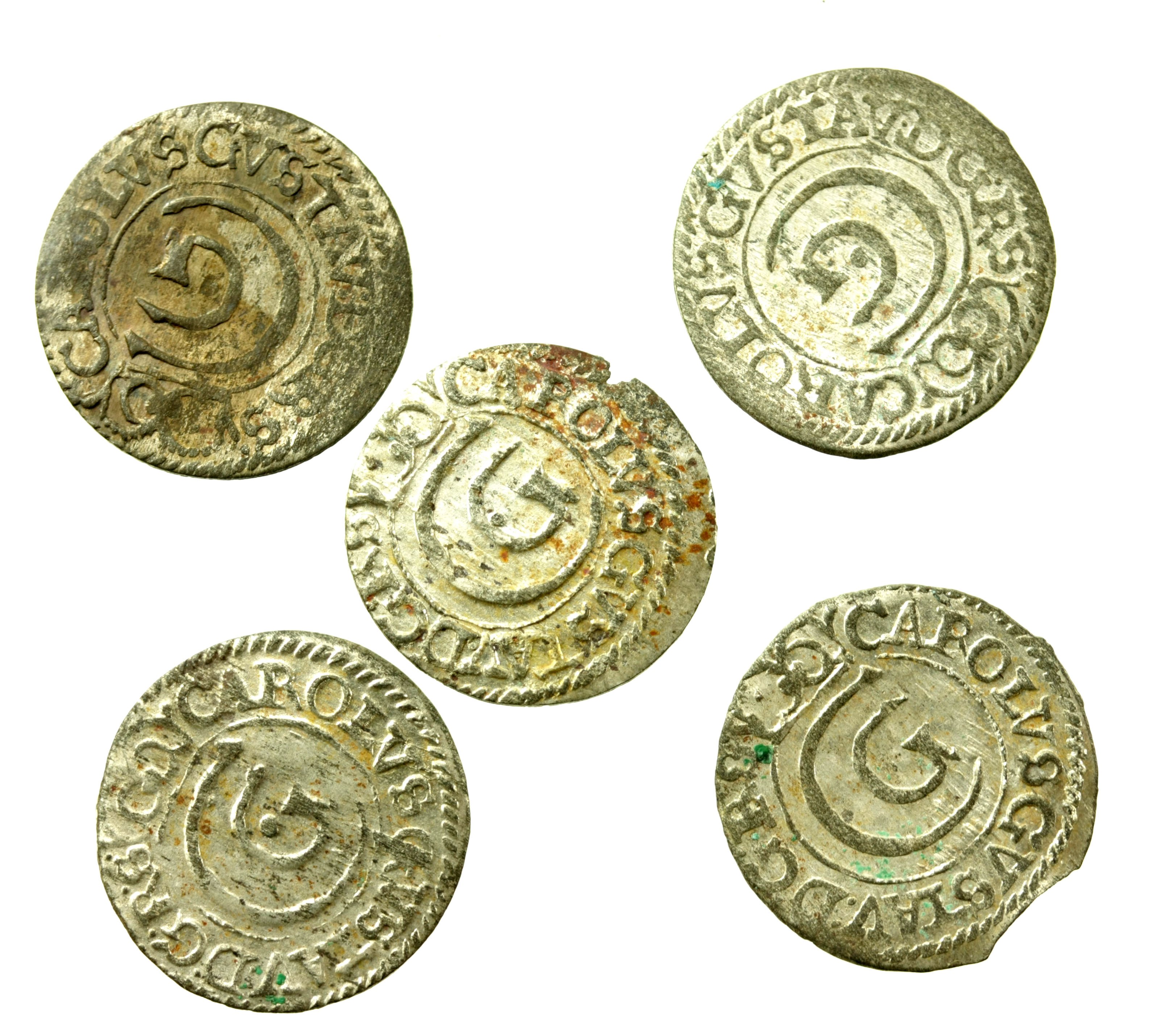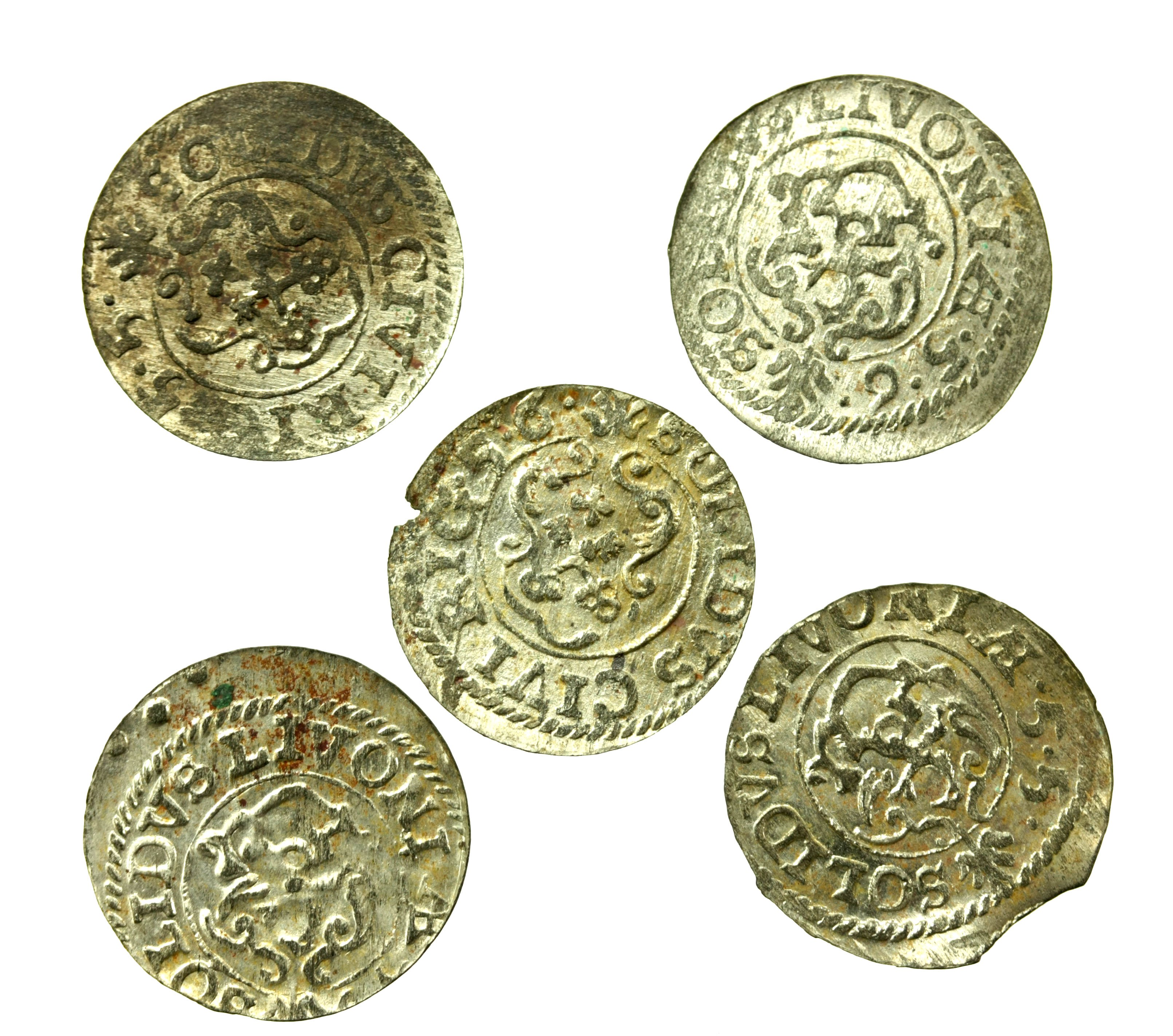 Liwonia i Ryga od panowaniem szwedzkim, Karol X Gustaw, Szelągi 1655-1656. Razem 5 szt. Stan 2/2+.