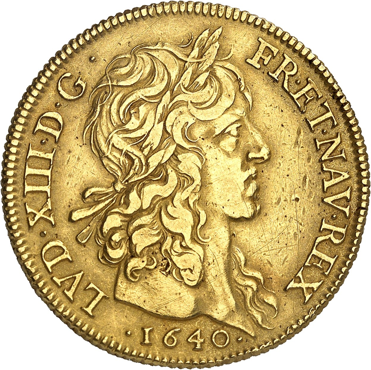 Av. LVD. XIII. D. G. - FR. ET. NAV. REX. Tête laurée du Roi à droite, au-dessous (date).