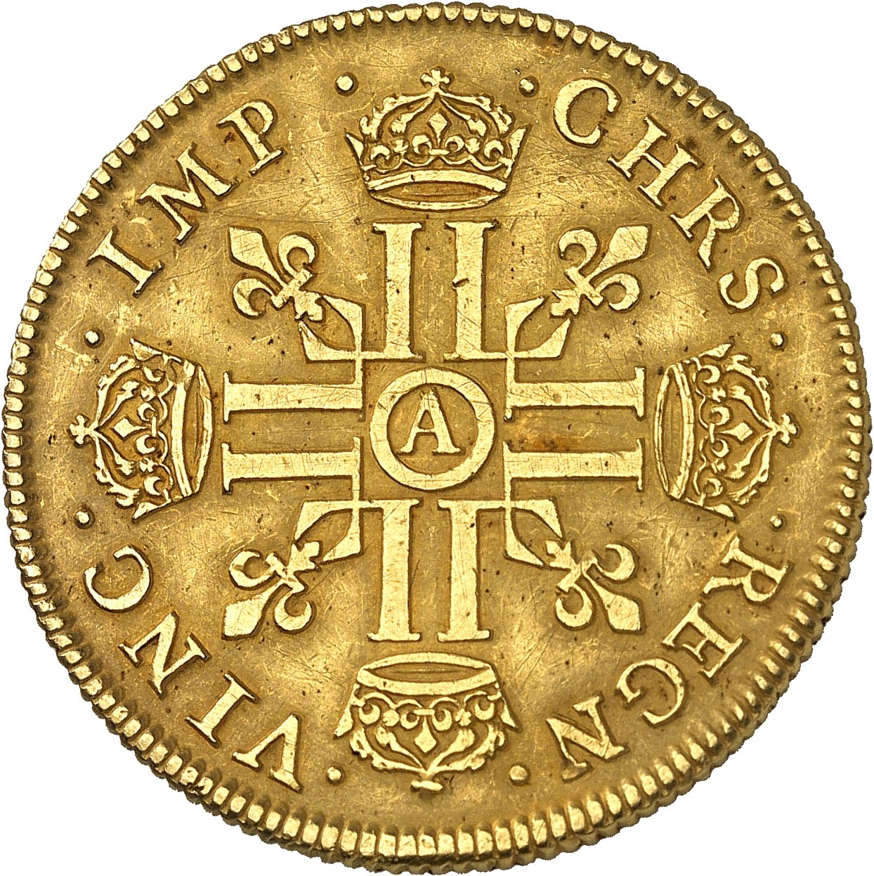 Rv. .CHRIS. - .REGN. - .VINC. - .IMP. Croix formée de huit L, chaque bras étant couronné, avec A dans un cercle en cœur, cantonnée de quatre lis divergeant du centre.