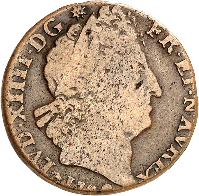 Av. (différent) LVD. XIIII. D. G (soleil) FR. ET. NAV. REX. Tête laurée du Roi à droite, les cheveux courts ; (date) au-dessous.