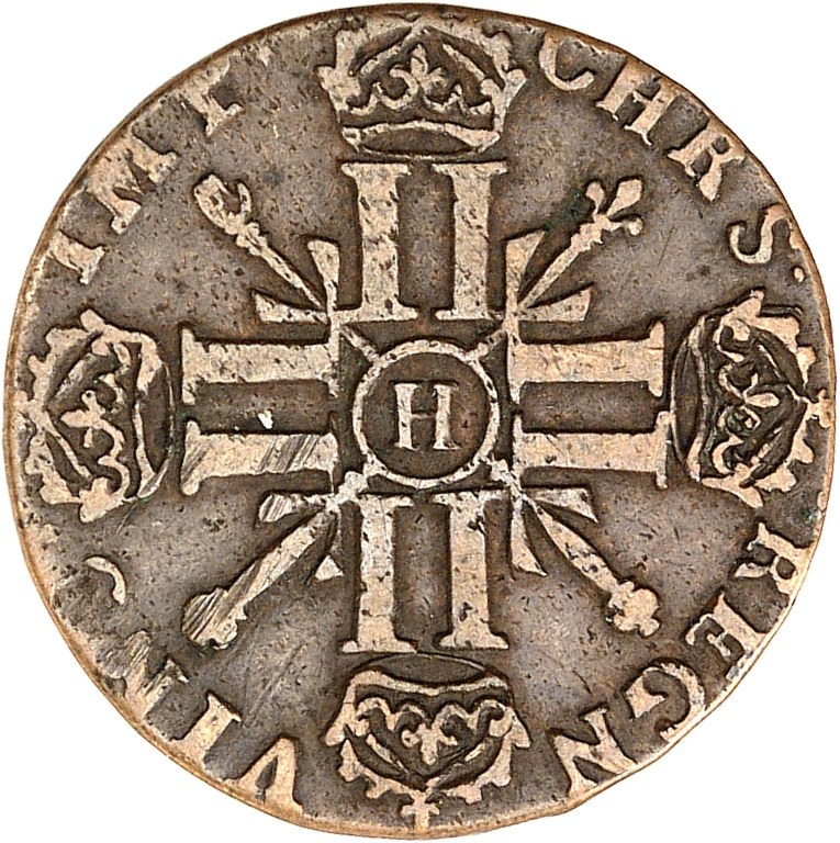 Rv. .CHRS. - .REGN. - .VINC. - .IMP. Croix formée de huit L adossées, chaque bras étant couronné, avec (atelier) dans un cercle en cœur, brochant sur une main de justice et un sceptre posés en sautoir.