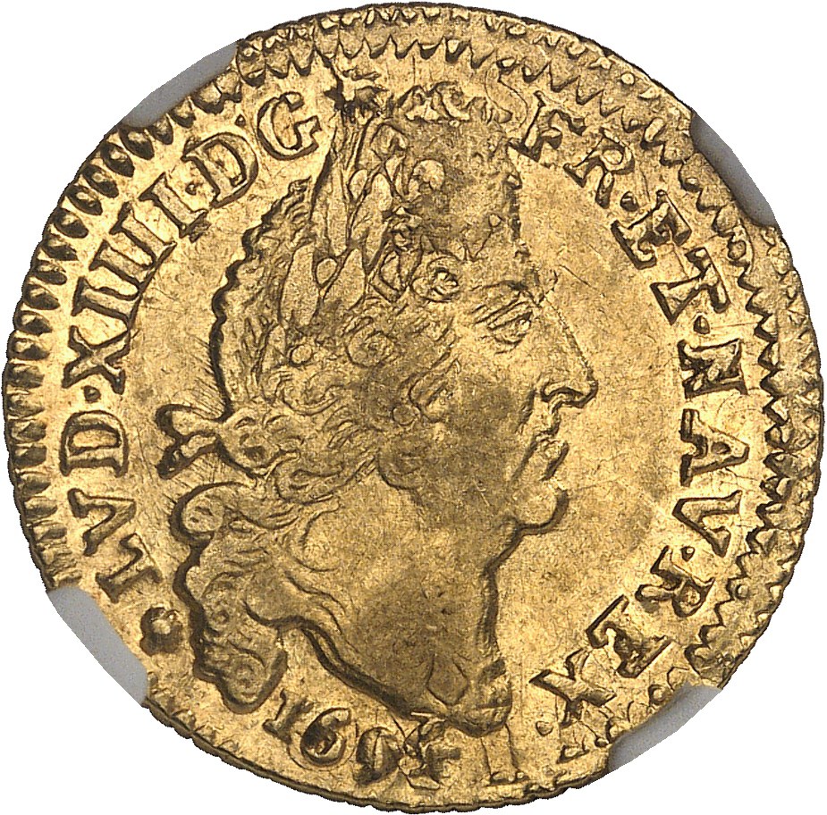 Av. (différent) LVD. XIIII. D. G. - FR. ET. NAV. REX. Tête âgée du Roi à droite, avec une grande perruque laurée ; au-dessous (date).