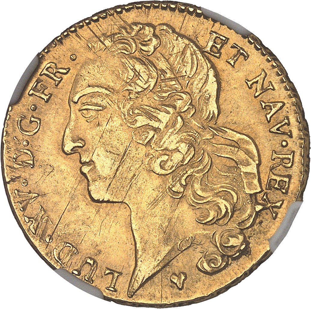 Av. LUD. XV. D. G. FR. - ET NAV. REX. Tête à gauche du Roi, ceinte d'un bandeau, au-dessous (différent).
