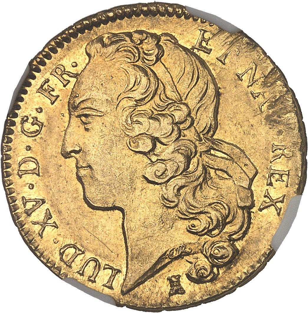 Av. LUD. XV. D. G. FR. - ET NAV. REX. Tête à gauche du Roi, ceinte d'un bandeau, au-dessous (différent).