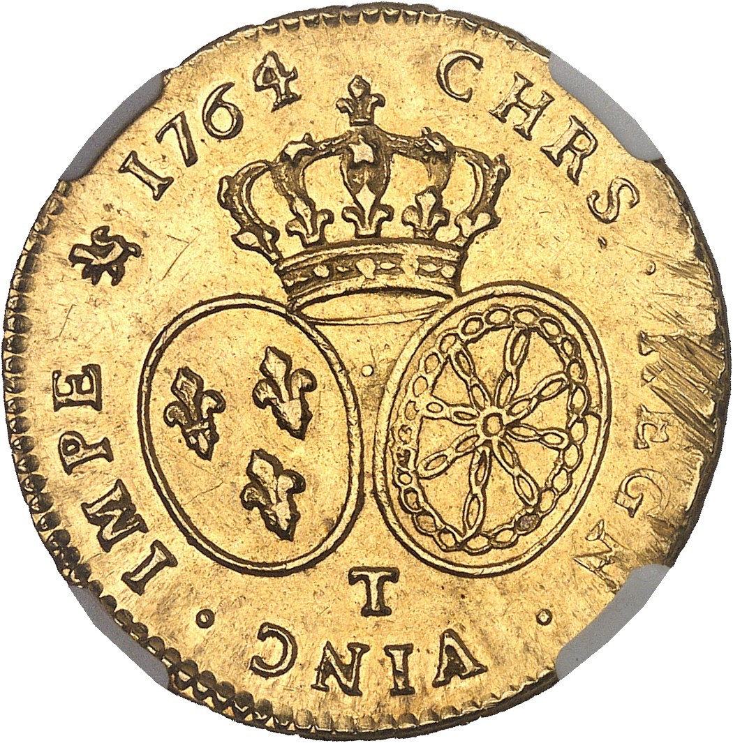 La date est modifiée 1764 sur 1762. Métal légèrement pincé à 2 h (stries d’ajustage). Conserve son brillant sous une légère patine. Très rare, sans doute le premier exemplaire vu à ce millésime. Superbe à Fleur de coin.