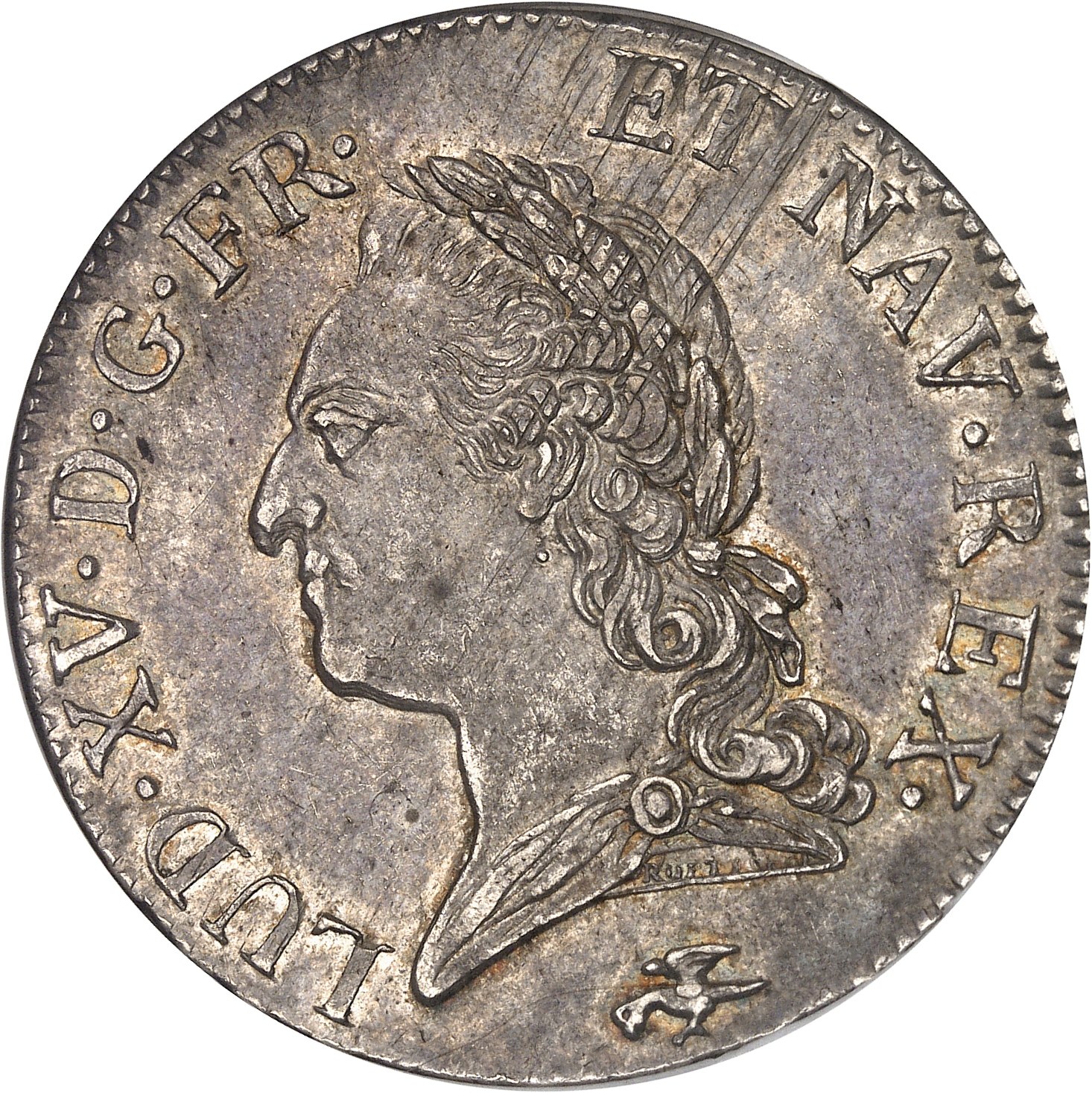 Av. LUD. XV. D. G. FR. ET NAV. REX. Tête à gauche du Roi, laurée, la base du cou drapée. Signature ROËTT. FIL sur la tranche du cou ; au-dessous (différent).