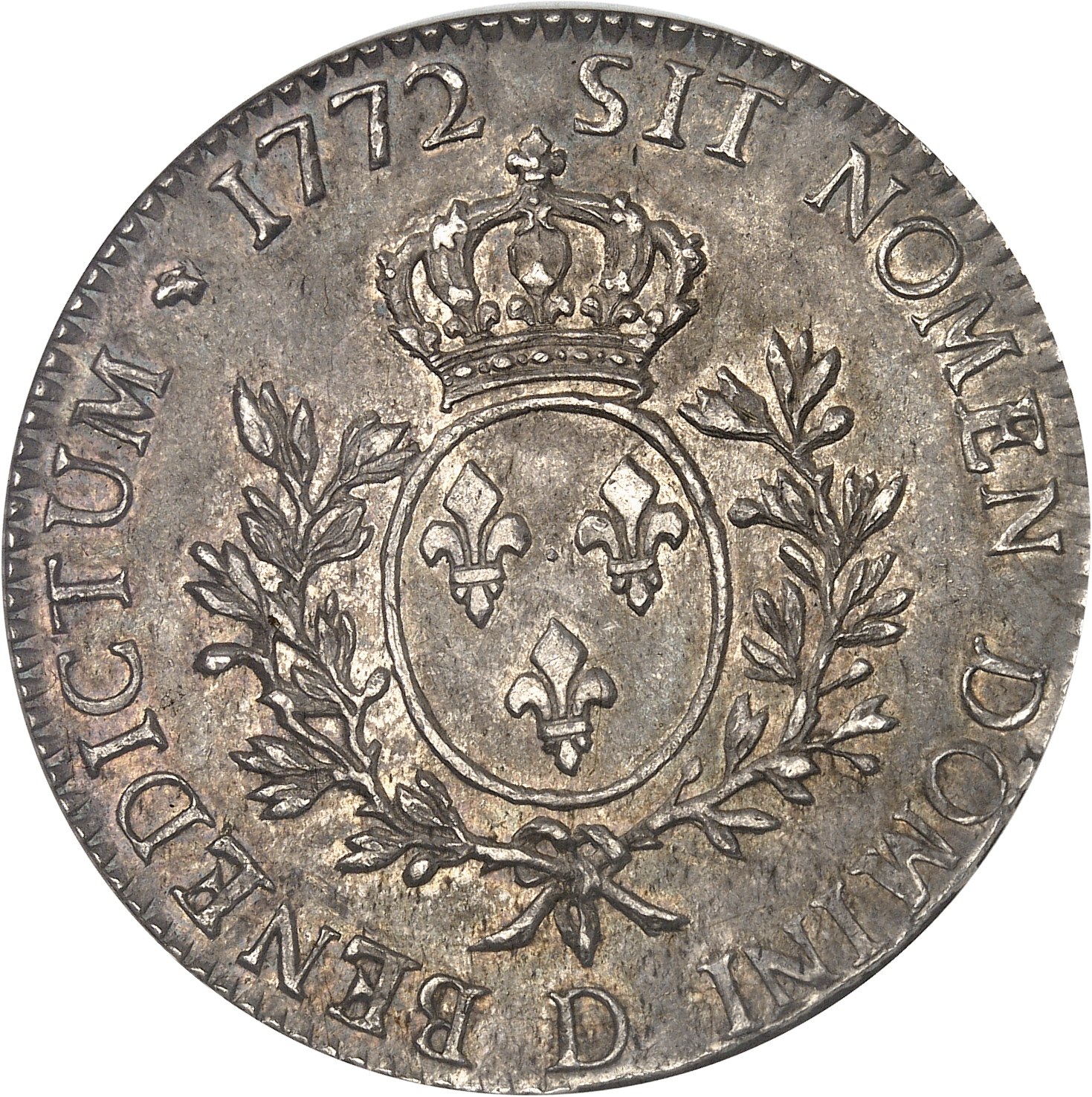 Rv. SIT. NOMEN. DOMINI. BENEDICTUM (différent) (date). Écu de France ovale, couronné, entre deux rameaux d’olivier ; au-dessous (atelier).