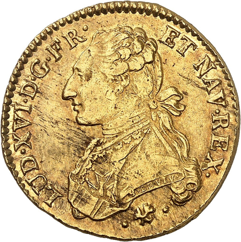 Av. LUD. XVI. D. G. FR. ET NAV. REX. Buste du Roi à gauche, en habit brodé, avec l’ordre du Saint-Esprit, les cheveux noués sur la nuque par un ruban. Signature B. DUVIV. sur la tranche du buste ; au-dessous (différent).