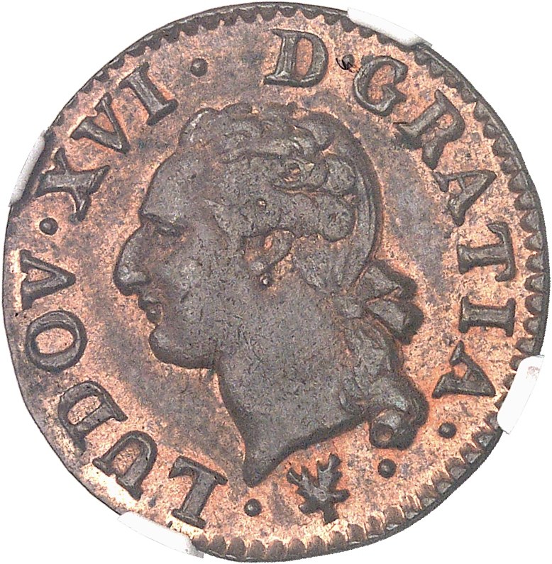 Av. LUDOV. XVI. D. GRATIA. Tête nue du Roi à gauche, les cheveux noués sur la nuque par un ruban ; au-dessous (différent).
