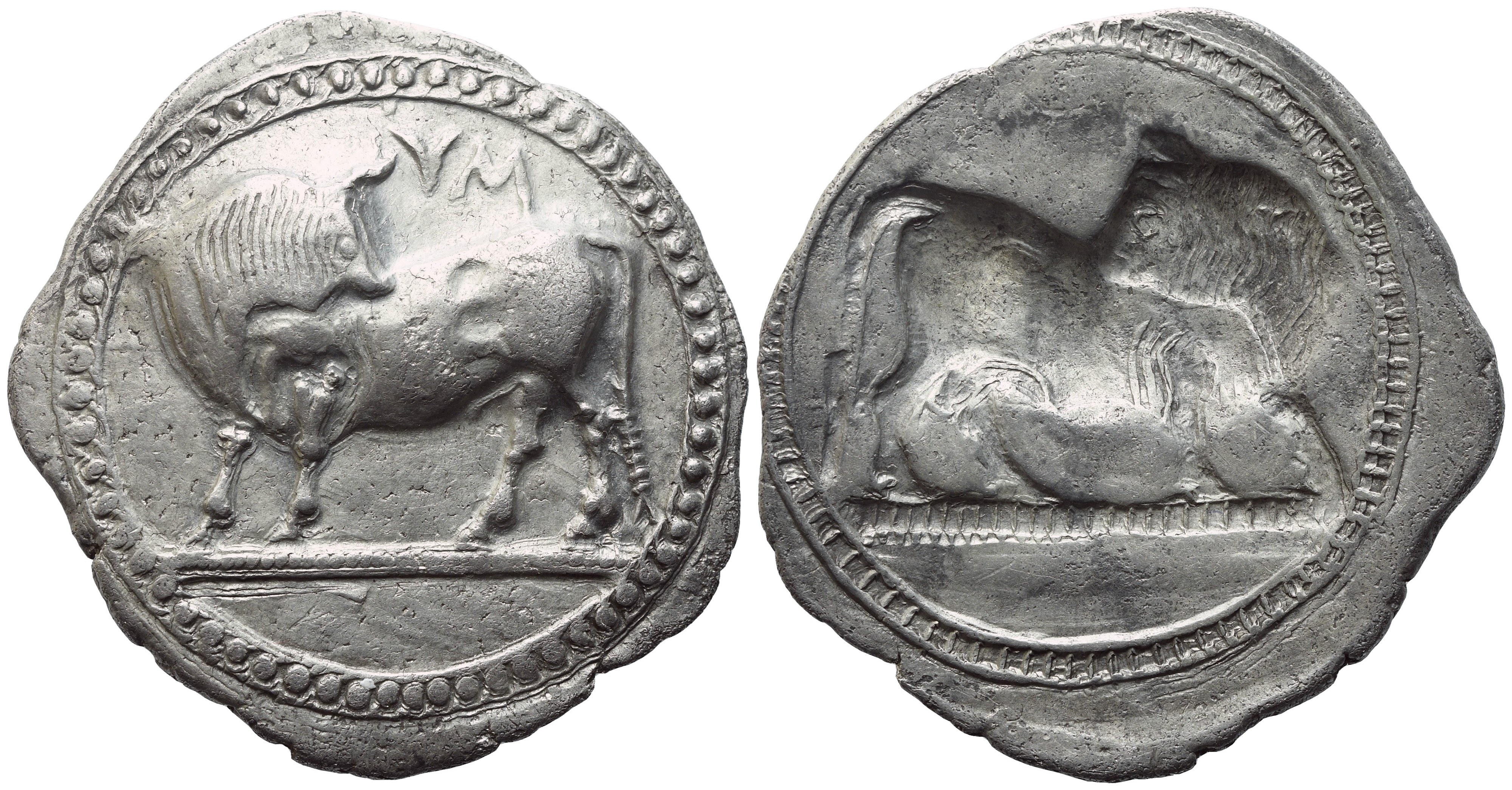 Bull standing left, head right; VM above; Rv. Incuse bull standing right, head left. Fabricius class A, fig. 3. SNG ANS 823. HN Italy 1729. About extremely fine.
