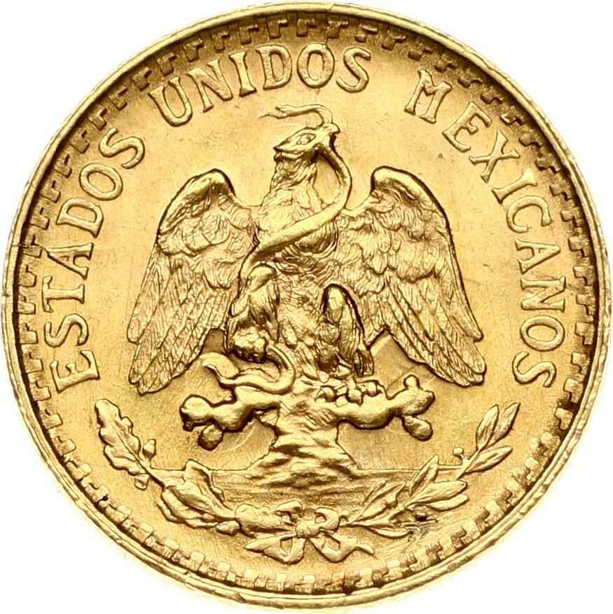 Mexico 2 Pesos 1945 Mo Obverse: Mexican eagle eating a snake on a cactus with wreath below and legend above. Lettering: ESTADOS UNIDOS MEXICANOS. Reverse: Denomination in large font surrounded by wreath and date. Lettering: 1945 DOS PESOS Mo. Edge: Reeded with a unique pattern. Gold 1.66g. Small Scratches. KM 461