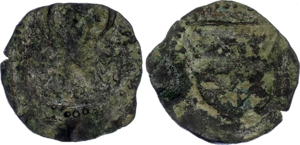 MBR# 418, N# 195080; Copper 0.60 g.; Alexandru cel Bun; Obv: Bull's (aurochs) head, star between horns. Rev: Coat of arms; VG