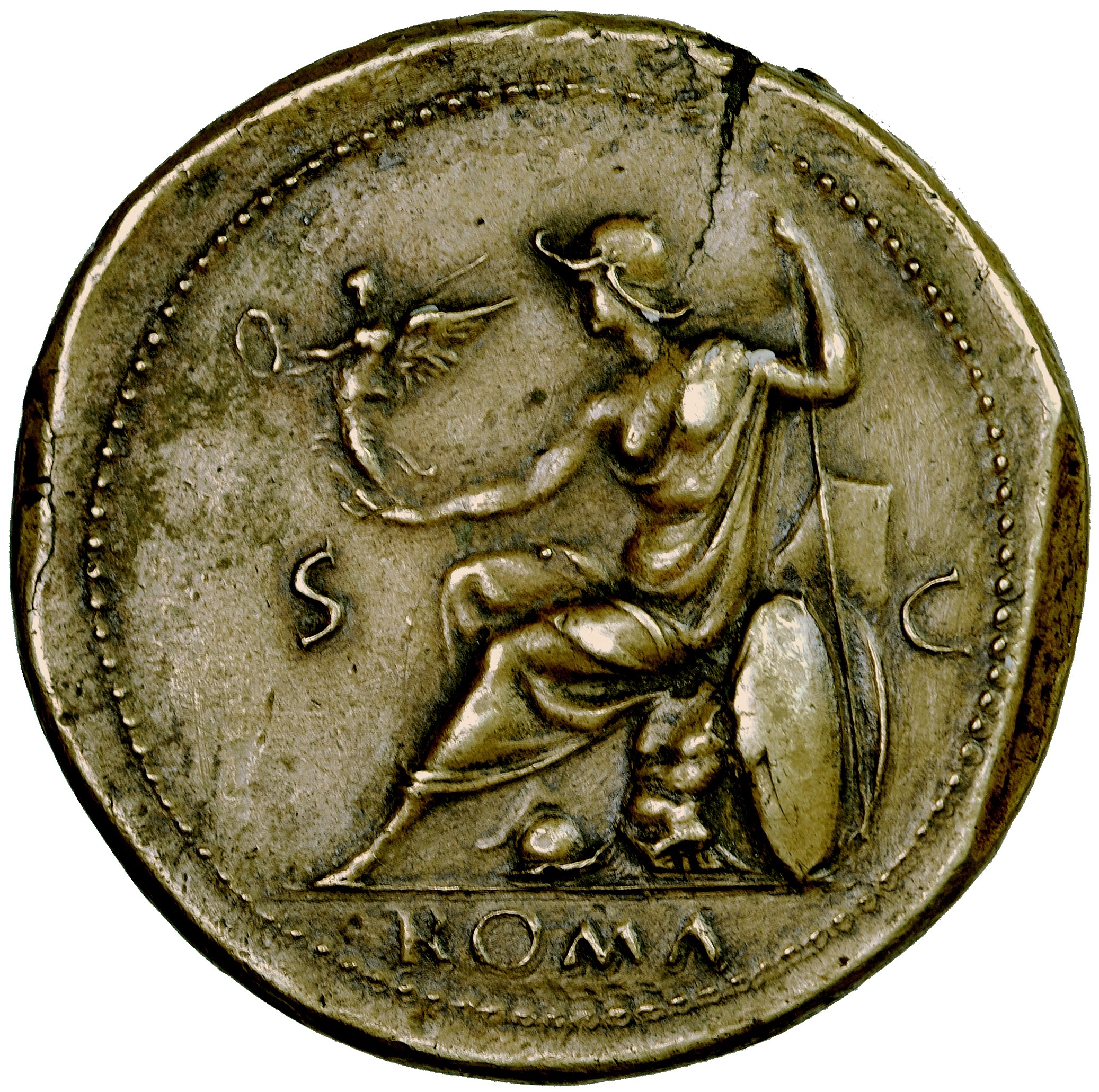Na szczególną uwagę zasługuje fakt, że medal jest bity, co wśród tzw. "paduańczyków" należy do dużej rzadkości. Jakość i poziom artystyczny wykonania tego okazu stawia go wśród najlepszych medali przypisywanych Giovanniemu Cavino (1500-1570), ewentualnie jego uczniom czy kontynuatorom. W naszej ocenie, autor przedstawianego dzieła sztuki nie kierował się niską intencją zrobienia falsyfikatu rzeczywistej monety starożynej, lecz stworzył, nie mający dokładnej analogii, medal inspirowany sestercami Nerona. Intencjonalnie umieścił w wyrytych przedstawieniach kilka świadczących o tym detali - np. nieznaną z oryginalnych emisji tego cesarza legendę awersu (... TR IM III PP) czy odwrócenie Wiktorii w przeciwną stronę, niż na monetach z epoki. Inne detale przedstawienia bogini Romy, jak np. hełm bez pióropusza, również sugerują, że jest to świadomy zabieg renesansowego twórcy.