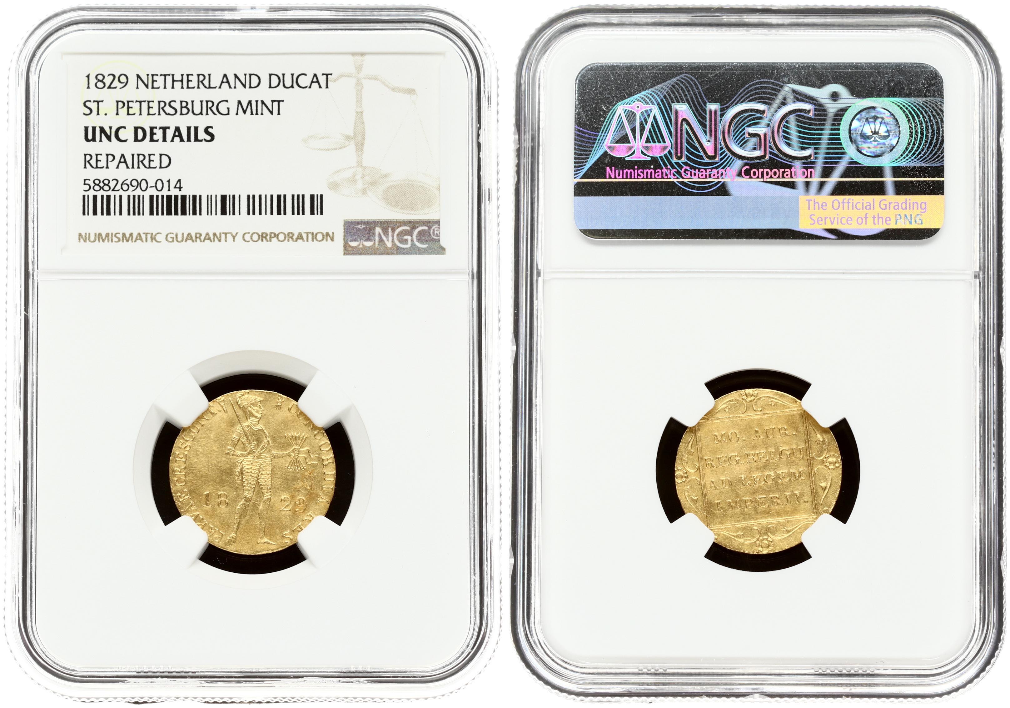 Netherlands 1 Ducat 1829 St Petersburg Mint. Imitating a gold Ducat of Willem I Rare Russia 1 Ducat 1829. Russian Empire time of Nicholas I (1826-1855). AV 1 Ducat. In the types of the Netherlands trade coinage. St. Petersburg (with the marks of Utrecht) dated 1829. PARVAE CRESCUNT• CONCORDIA RES knight standing right holding sword and bundle of arrows; sword and caduceus (privy mark and mintmark) across upper fields date across lower fields / MO• AUR• REG• BELGII AD LEGEM IMPERII• inscribed within ornamented cartouche. Gold. Friedberg 161. (date unlisted); KM-50 (under Netherlands). RARE NGC UNC DETAILS