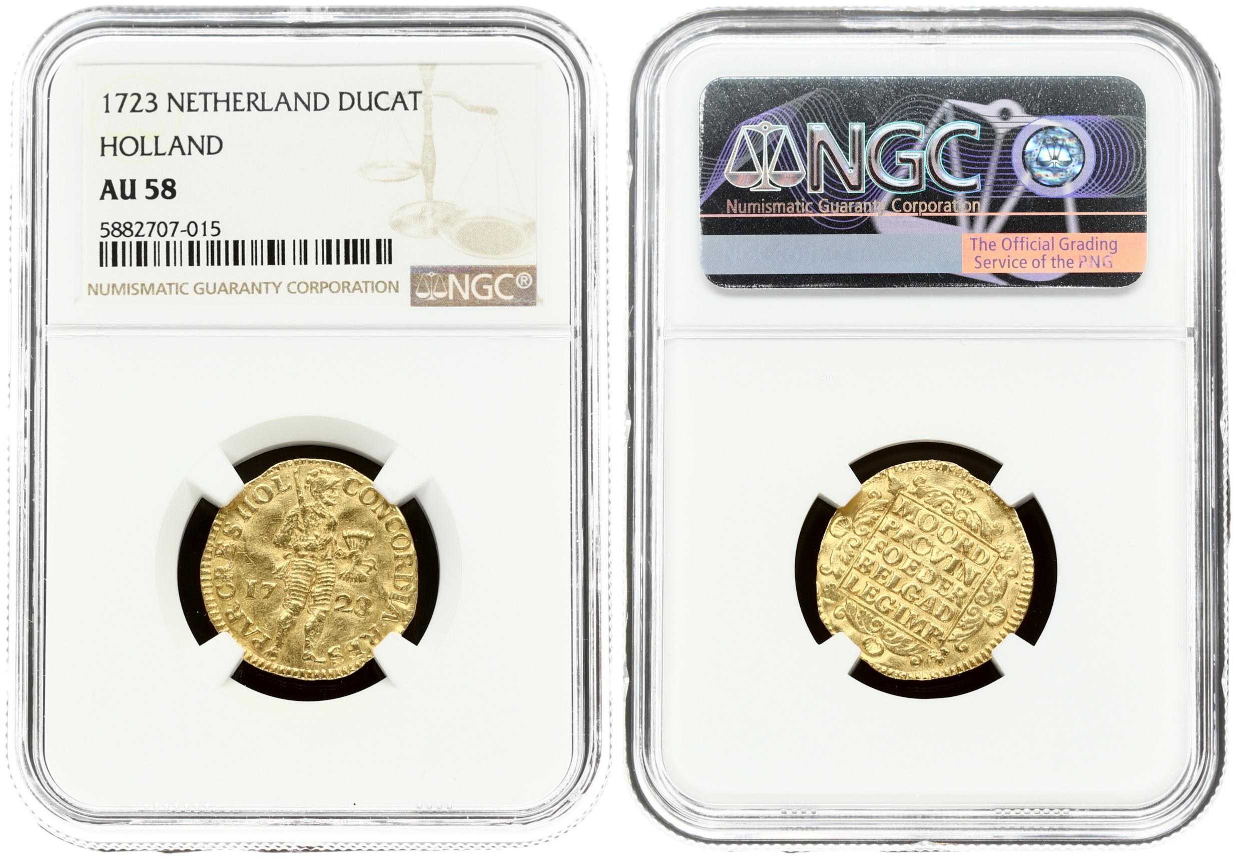 Netherlands HOLLAND 1 Ducat 1723 Averse: Armored; standing Knight holding bundle of arrows divides date without inner circle. Averse Legend: CONCORDIA • RES - PAR • CRES(CVNT) • (HOL) •. Reverse: Inscription within ornamented square. Reverse Inscription: MO:ORD:/ PROVIN./ FOEDER / BELG: AD/ LEG IMP. Gold. KM 12.2. RARE NGC AU 58 TOP POP