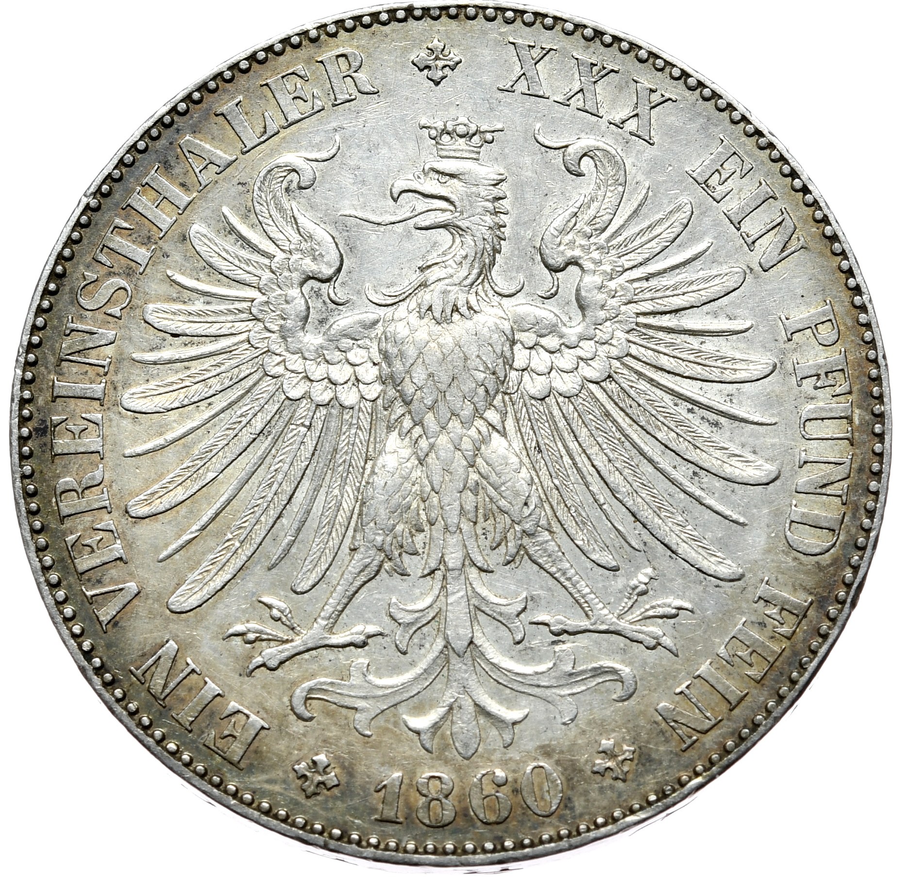 Piękny talar miejski z Francofurtią, czyli żeńską personifikacją miasta Frankfurt nad Menem na awersie. Piękny połysk i wiekowa patyna.