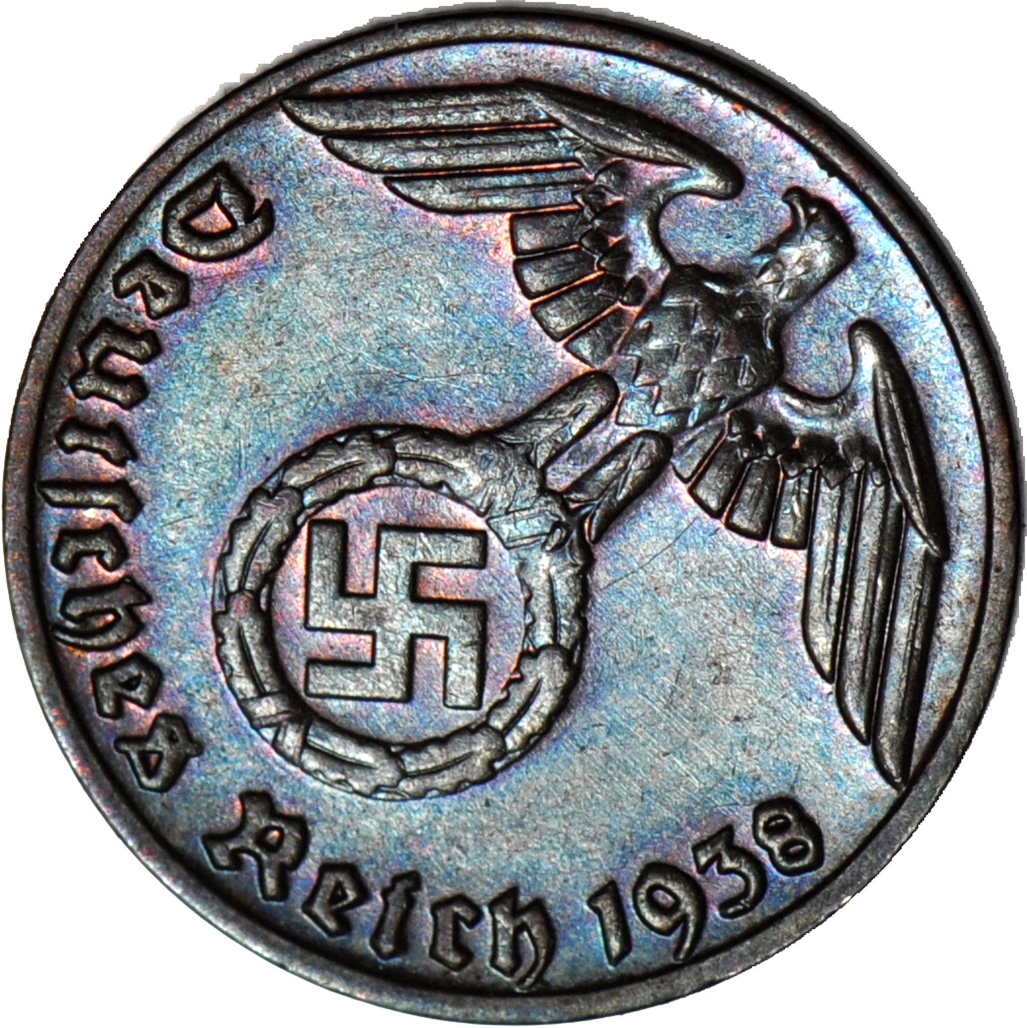 Niemcy, III Rzesza, 1 Pfennig 1938 E, destrukt, skrętka 45 stopni