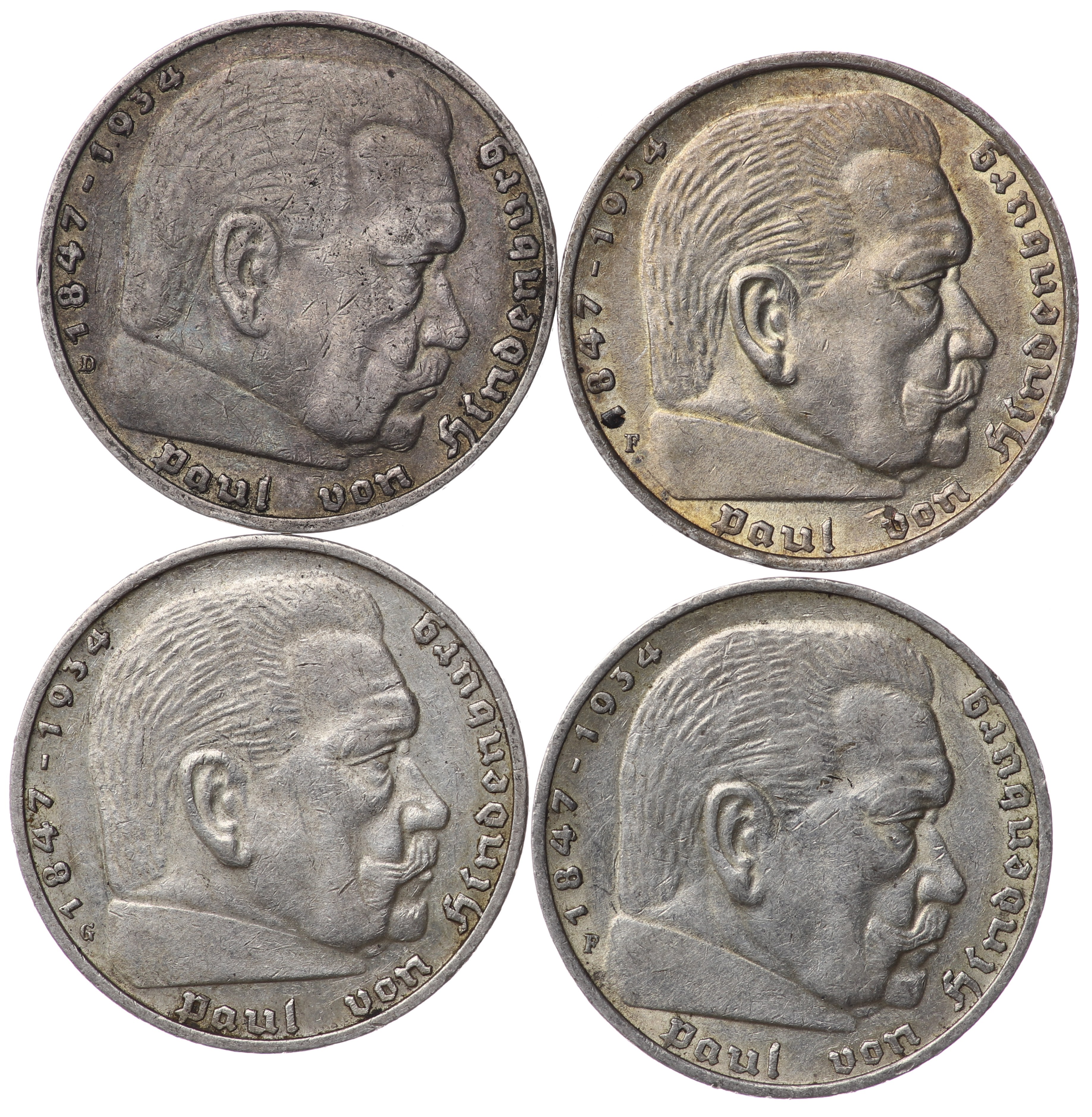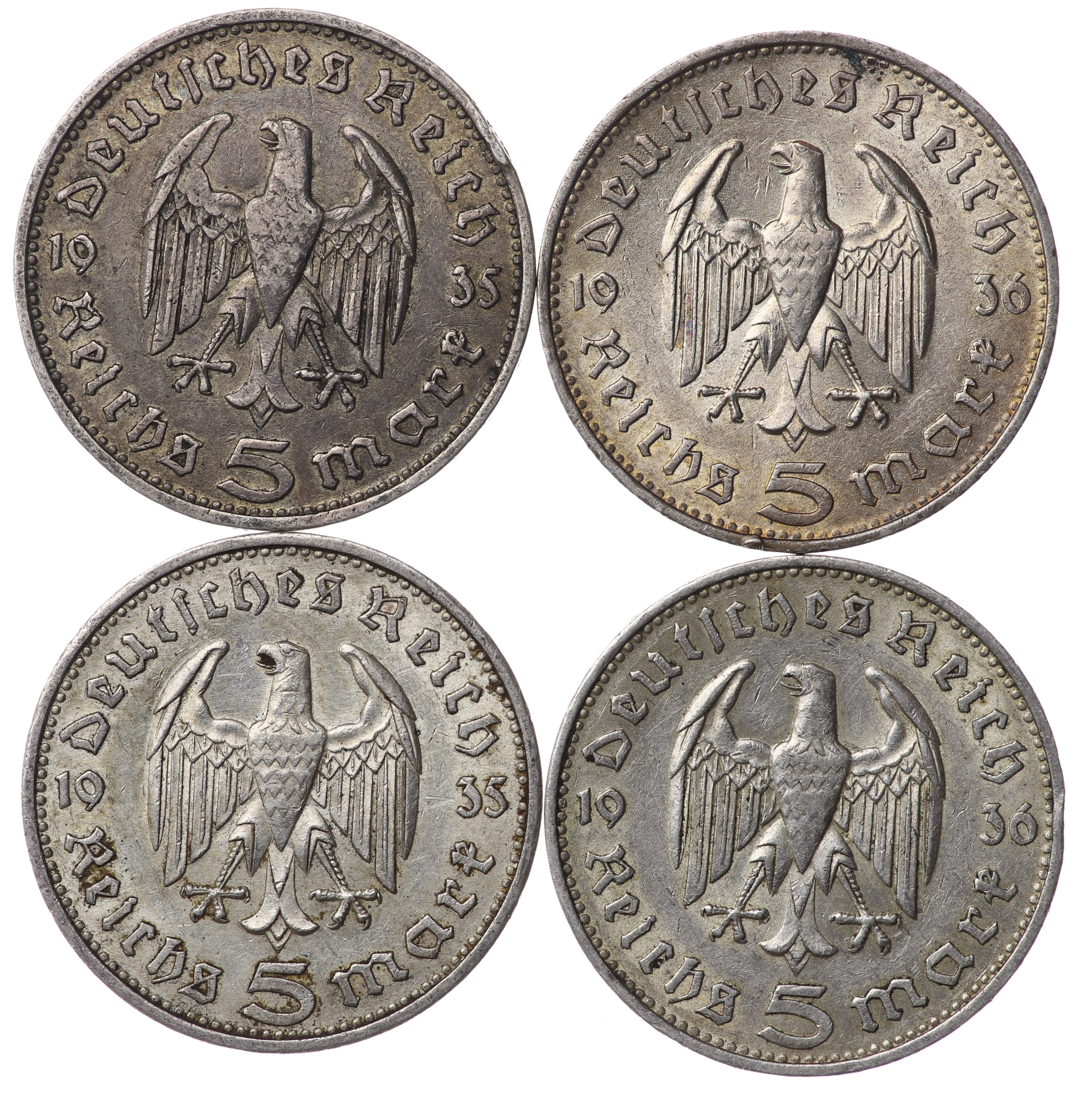 Niemcy, III Rzesza, 5 marek 2 x1935, 2 x 1936 Hindenburg - zestaw 4 sztuk