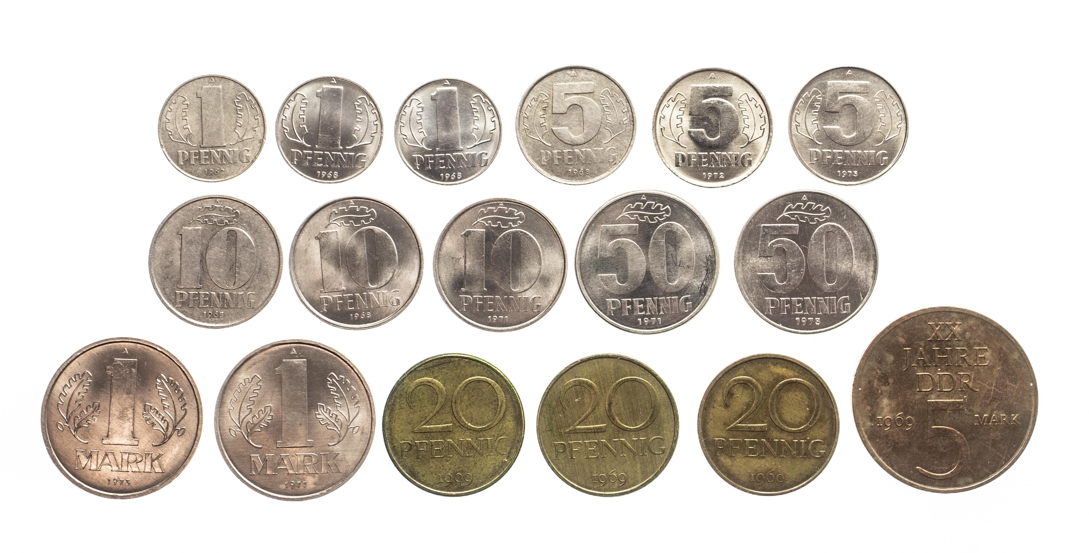17 monet w zestawie: 1pf 1962 (3), 2 x 1968 (1), 5 pf 1968 (3), 1972, 1975 (1), 10 pf 1965 (3), 1968, 1971 (1), 3 x 20 pf 1969 (2,3), 50 pf 1971, 1973 (1), 1 marka 1973, 1977 (1) oraz 5 marek 1969 (2).