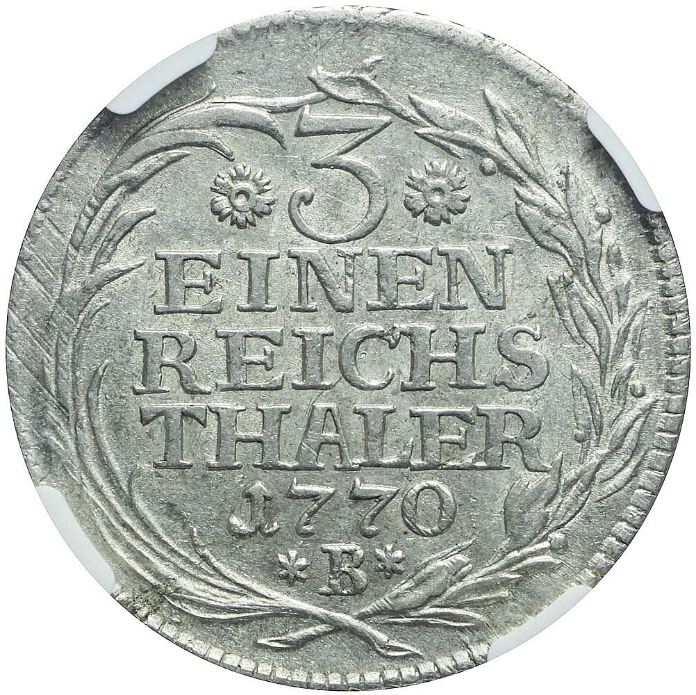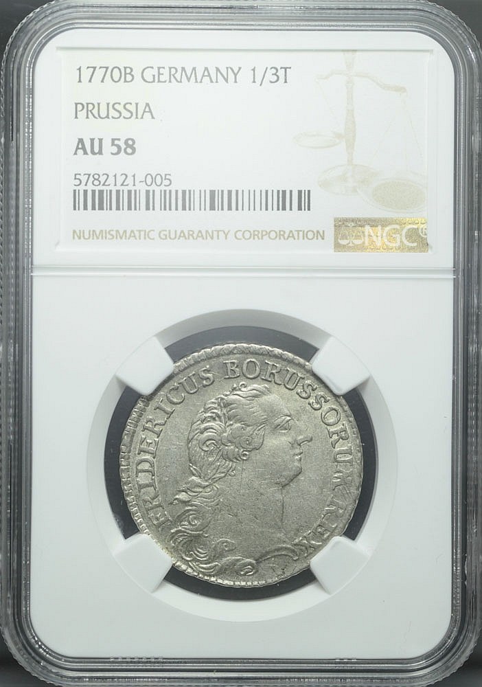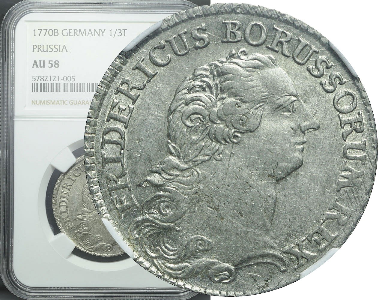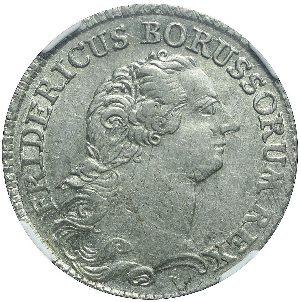 Moneta wybita po zdobyciu Śląska przez wojska pruskie. Bardzo ładny egzemplarz z menniczym połyskiem. Według naszej opinii niedoceniona moneta przez NGC.
