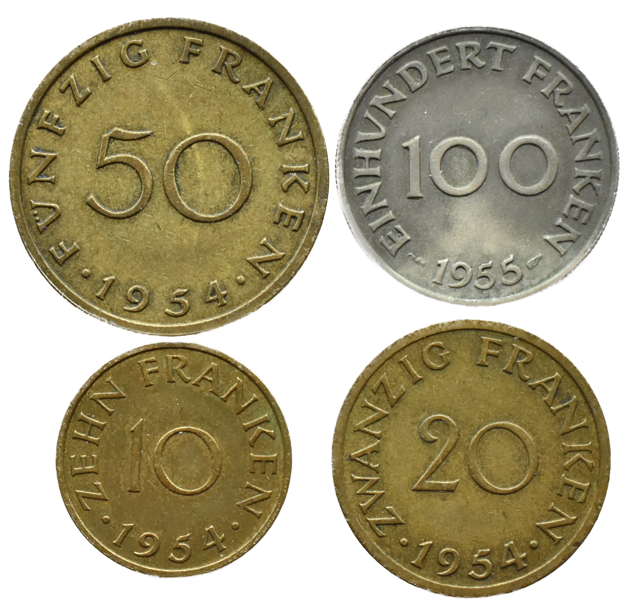 Niemcy, Saarland, komplet 10-100 franków 1954-1955, Paryż